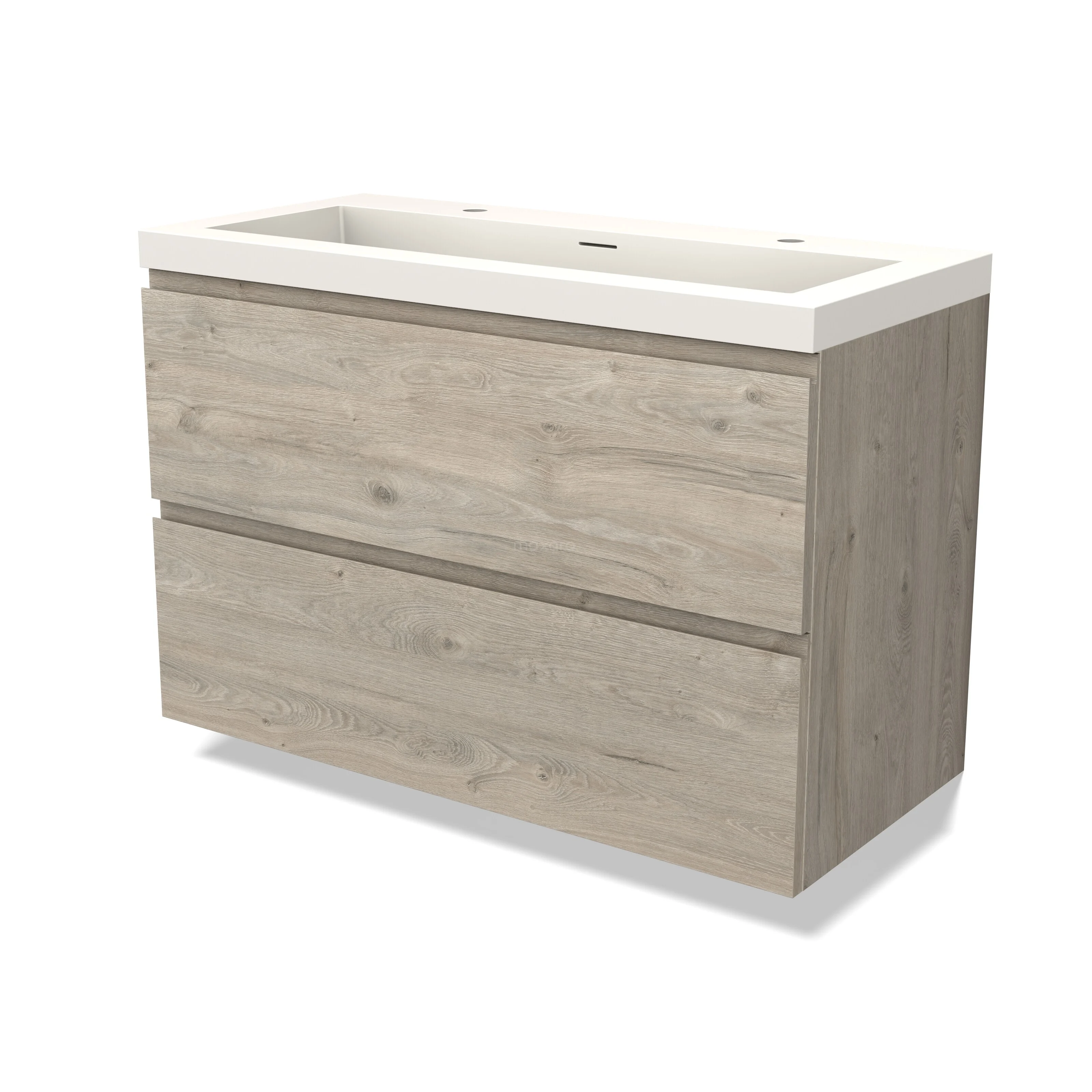 Modulo Badkamermeubel met wastafel | 100 cm Lichtgrijs eiken Greeploos front Solid surface 2 lades onder elkaar