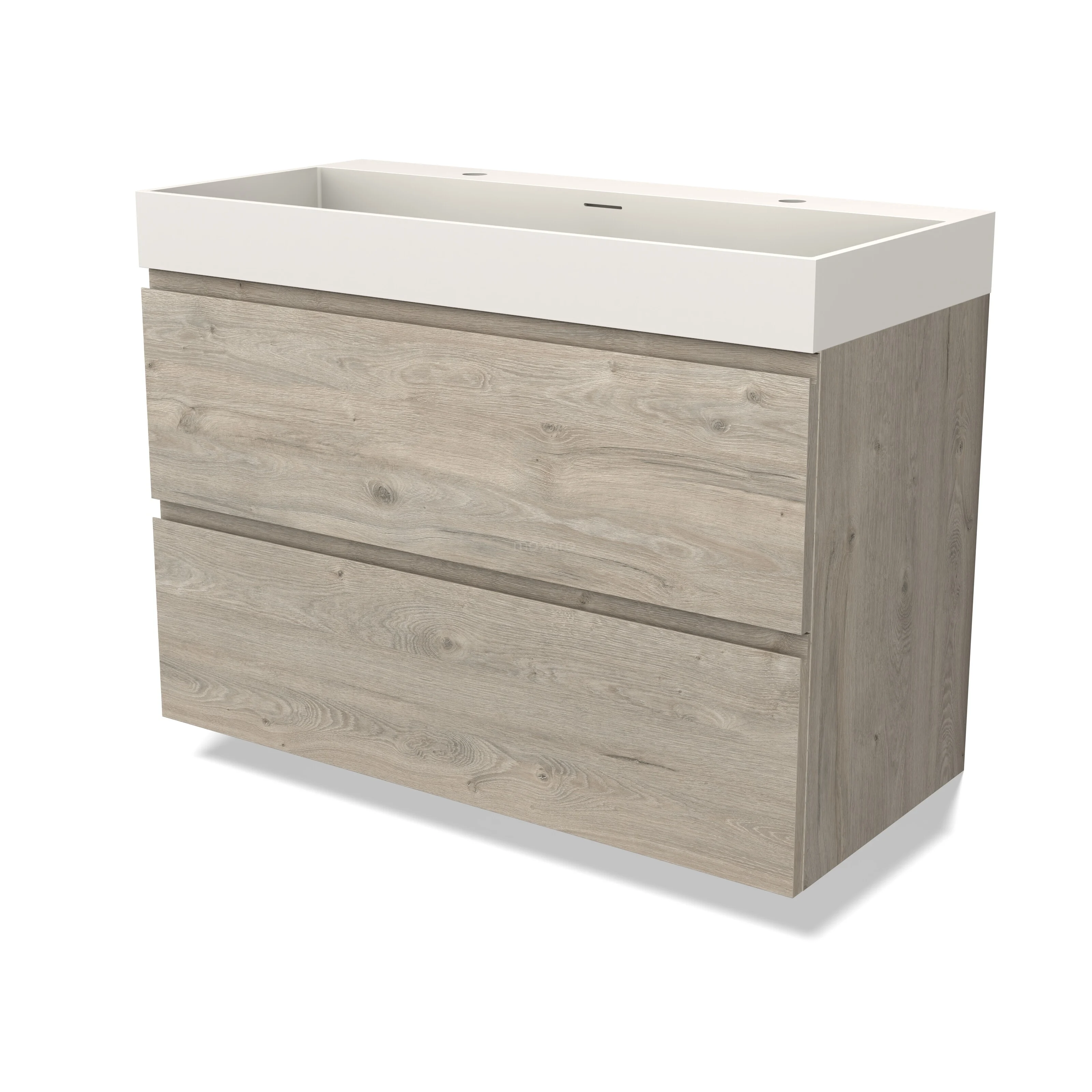 Modulo Badkamermeubel met wastafel | 100 cm Lichtgrijs eiken Greeploos front Solid surface 2 lades onder elkaar