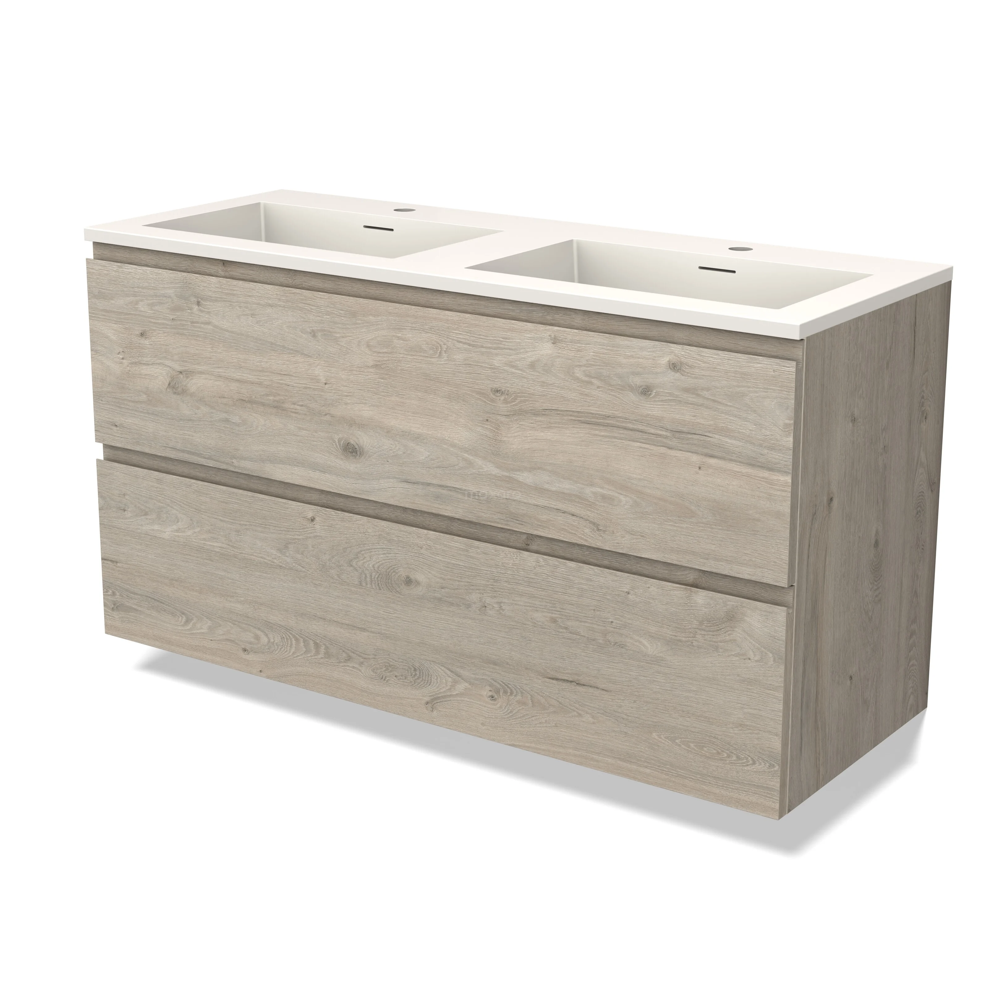 Modulo Badkamermeubel met wastafel | 120 cm Lichtgrijs eiken Greeploos front Solid surface 2 lades onder elkaar
