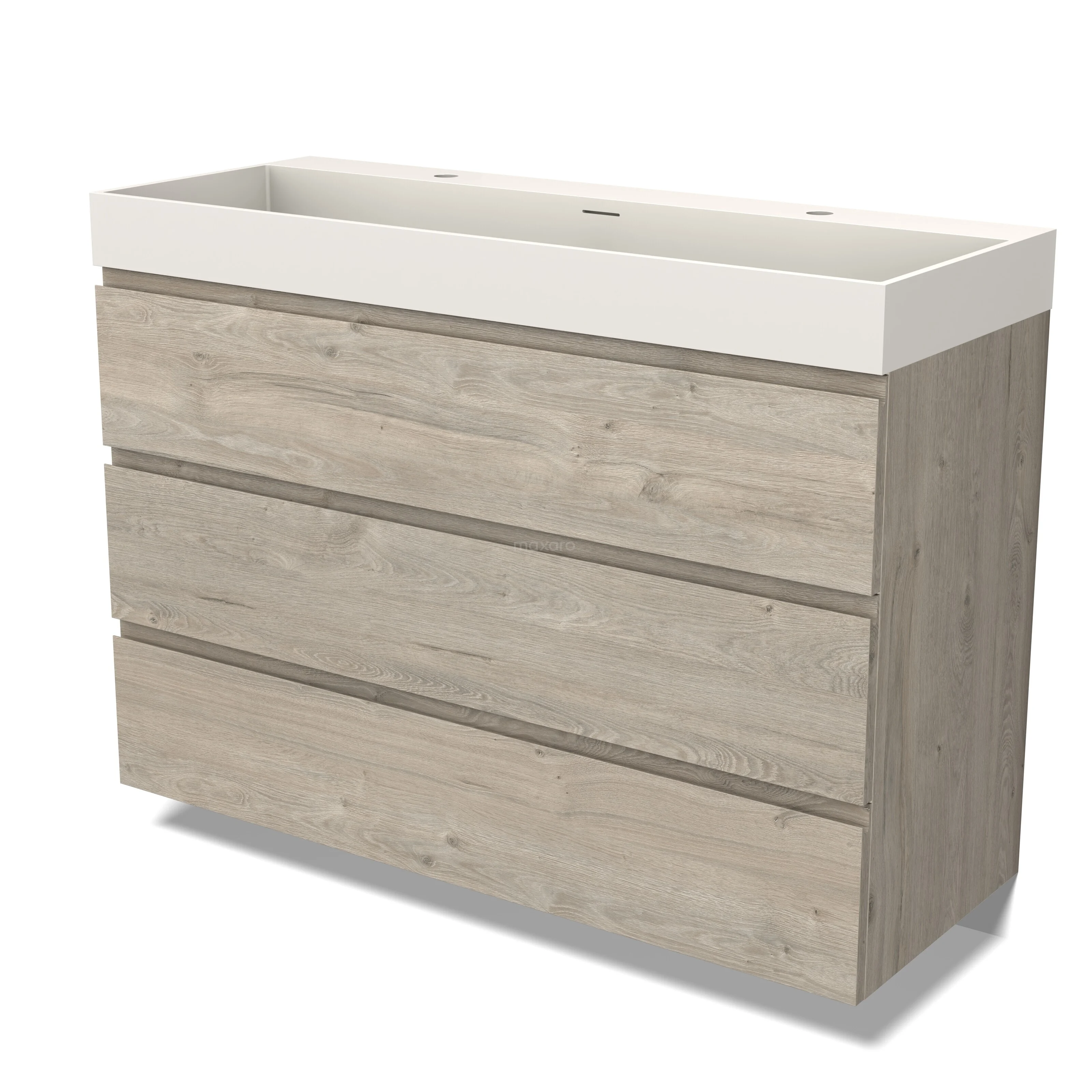 Modulo Badkamermeubel met wastafel | 120 cm Lichtgrijs eiken Greeploos front Solid surface 3 lades
