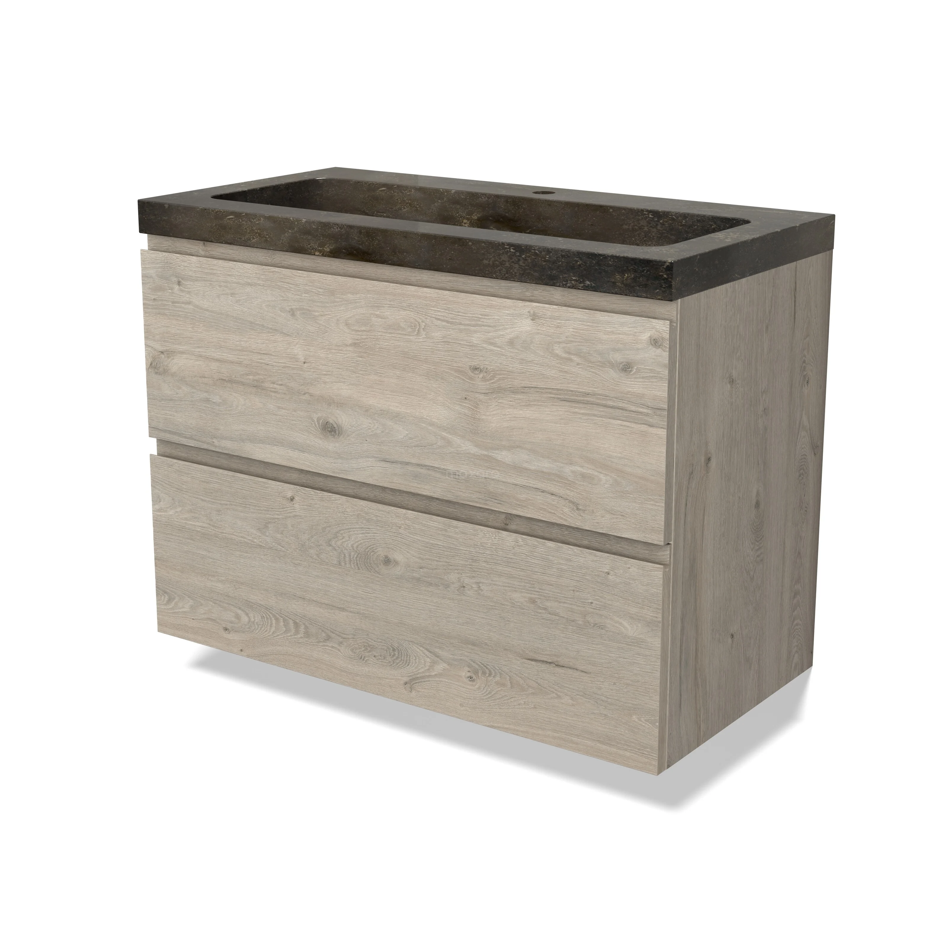 Modulo Badkamermeubel met wastafel | 90 cm Lichtgrijs eiken Greeploos front Natuursteen 2 lades onder elkaar