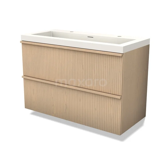 Modulo Plus onderscheidt zich door zijn unieke fronttypes en elegante, afgeronde vormgeving. Het ribbelfront kenmerkt zich door verfijnde verticale lijnen en een houten handgreep over de gehele bovenzijde, wat zorgt voor een trendy en stijlvol design, terwijl het natuurlijke hout en het subtiele lijnenspel een warme, exclusieve uitstraling geven. Met een breedte van 100 cm biedt het meubel volop ruimte voor jouw dagelijkse verzorging.
