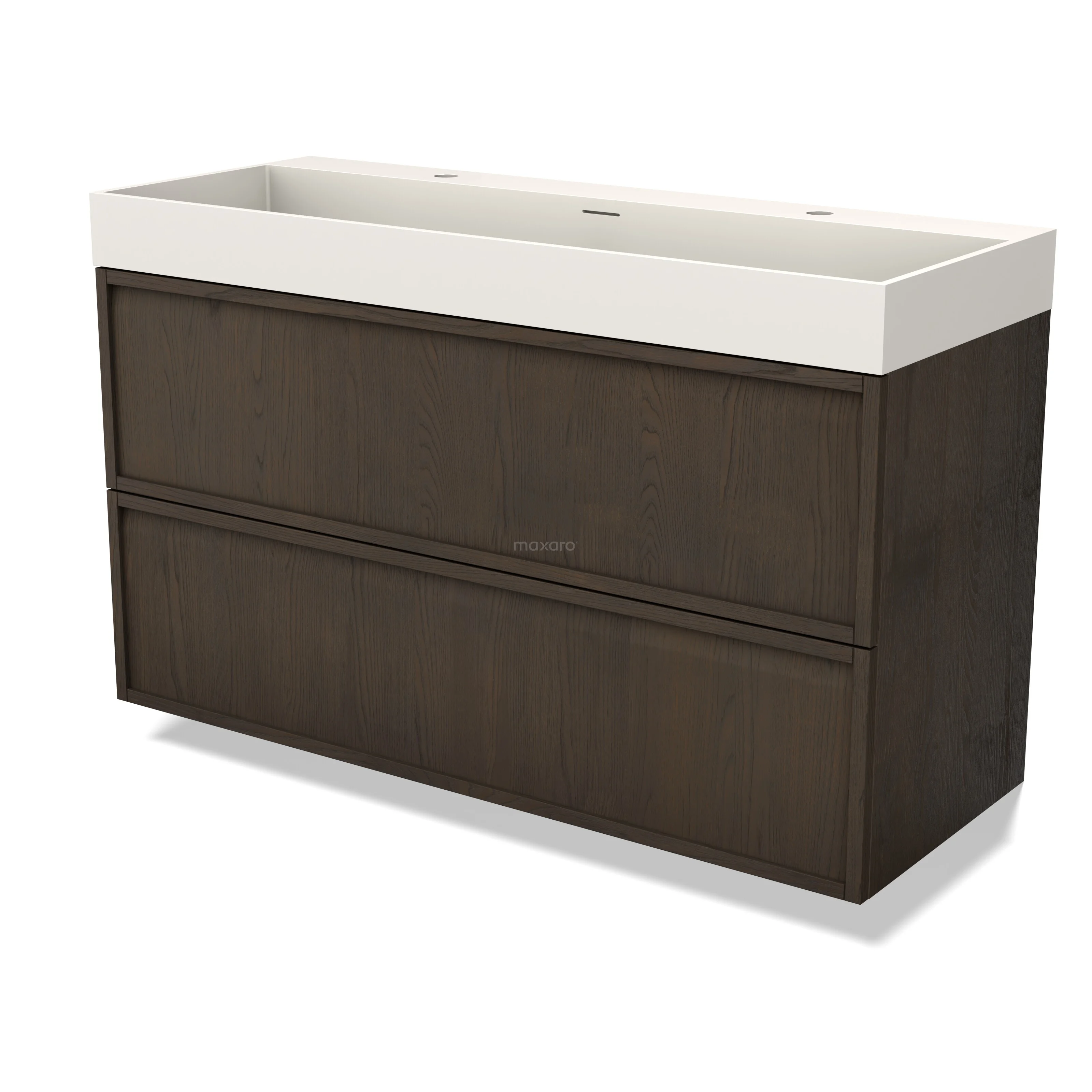 Modulo Plus onderscheidt zich door zijn unieke fronttypes en elegante, afgeronde vormgeving. Het framefront is een moderne versie van het klassieke kaderfront, met smalle latten en een geïntegreerde handgreep die zorgen voor een eigentijdse, landelijke uitstraling, terwijl het natuurlijke hout en het subtiele lijnenspel een warme, exclusieve uitstraling geven. Met een breedte van 120 cm biedt het meubel volop ruimte voor jouw dagelijkse verzorging.