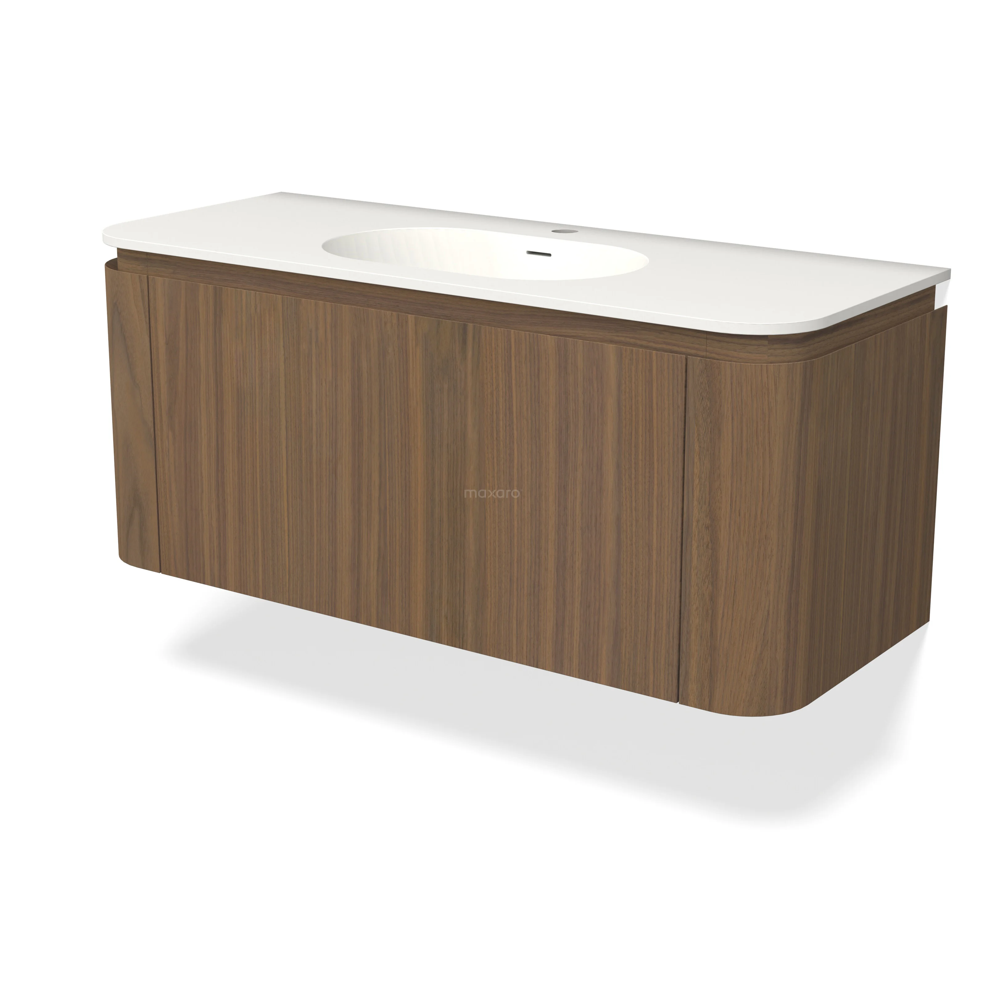 Het meubel is gecombineerd met een stijlvolle, afgeronde wastafel van solid surface. Deze wastafel sluit perfect aan bij de premium uitstraling van het meubel.