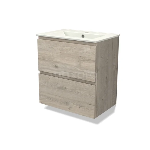 Modulo Slim Badkamermeubel met wastafel | 60 cm Lichtgrijs eiken Greeploos front Keramiek 2 lades onder elkaar