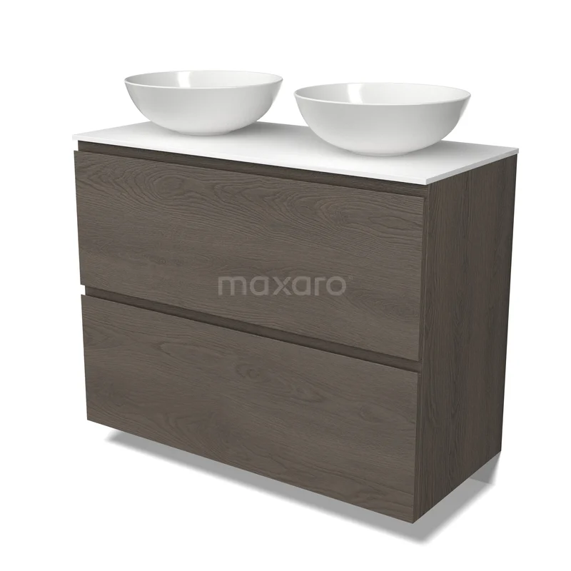 Modulo Plato Badkamermeubel voor waskom | 100 cm Donkerbruin eiken Greeploos front Solid surface blad 2 hoge lades onder elkaar