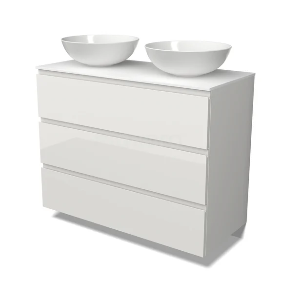 Modulo Plato Badkamermeubel voor waskom | 100 cm Hoogglans wit Greeploos front Solid surface blad 3 lades
