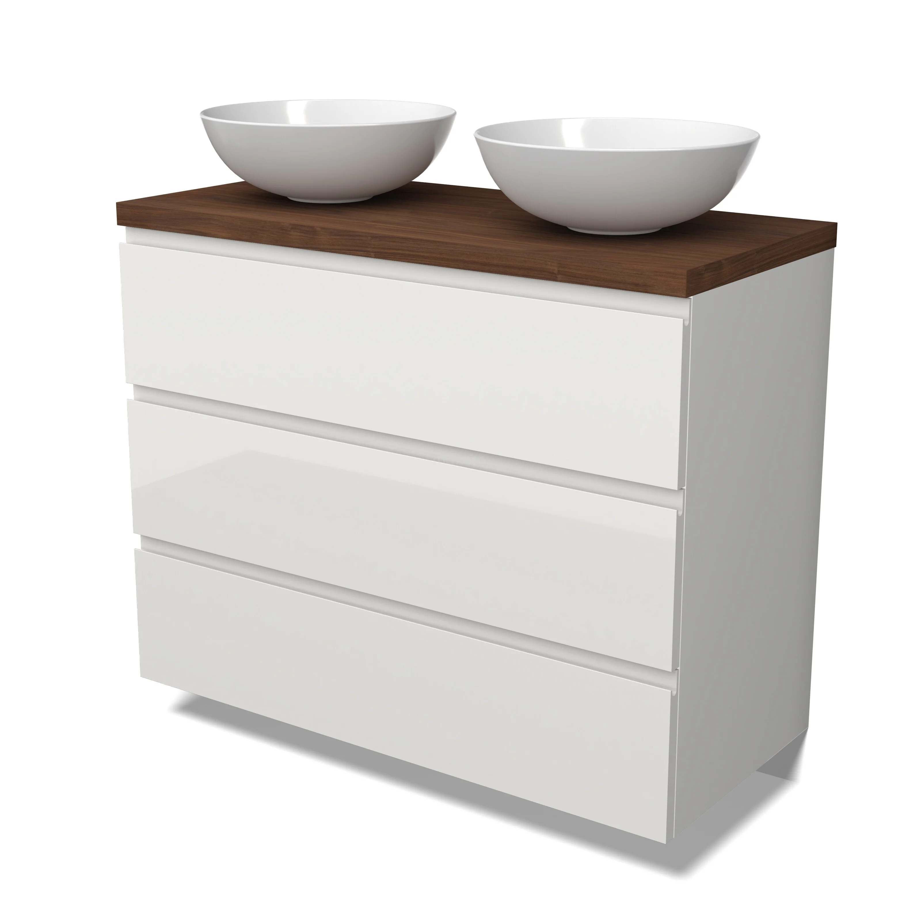 Modulo Plato Badkamermeubel voor waskom | 100 cm Hoogglans wit Greeploos front Walnoot blad 3 lades