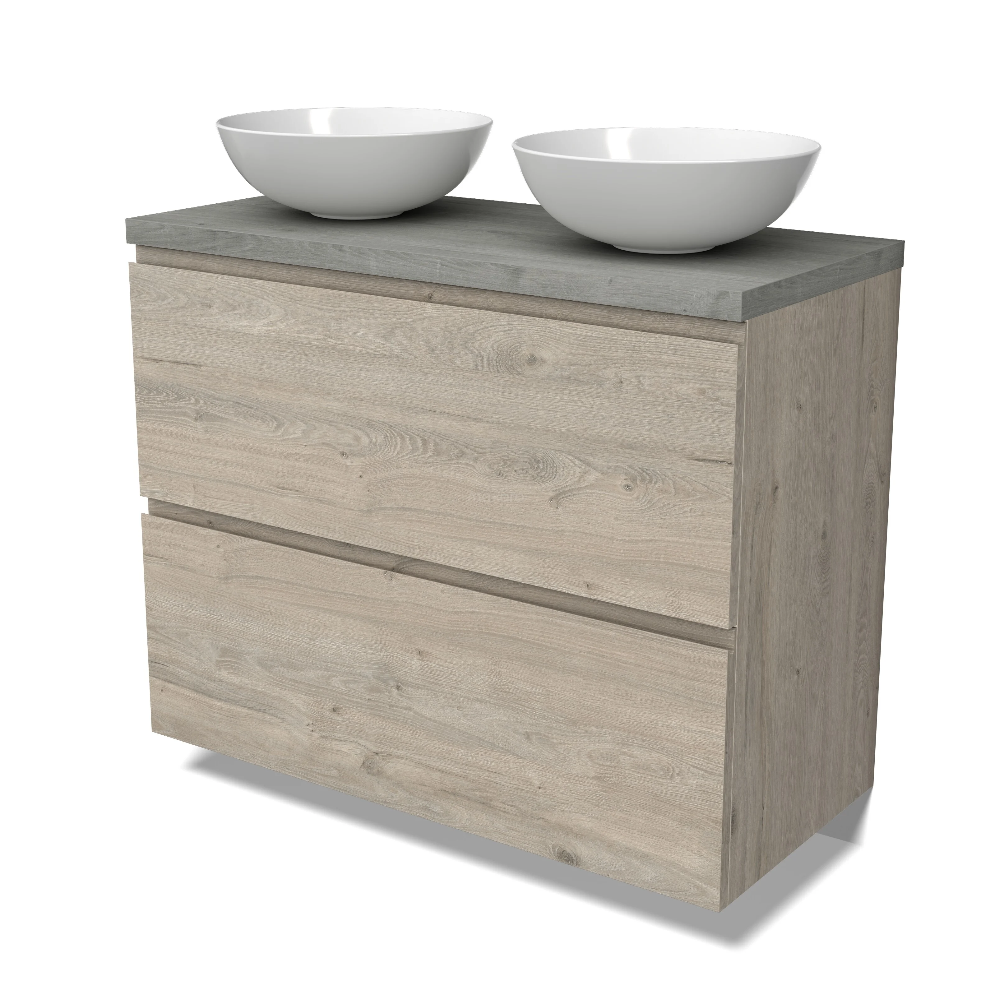 Modulo Plato Badkamermeubel voor waskom | 100 cm Lichtgrijs eiken Greeploos front Grijs eiken blad 2 hoge lades onder elkaar