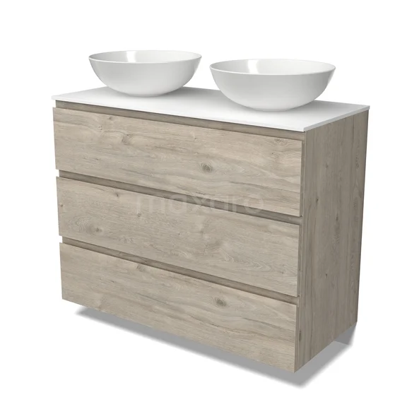 Modulo Plato Badkamermeubel voor waskom | 100 cm Lichtgrijs eiken Greeploos front Solid surface blad 3 lades