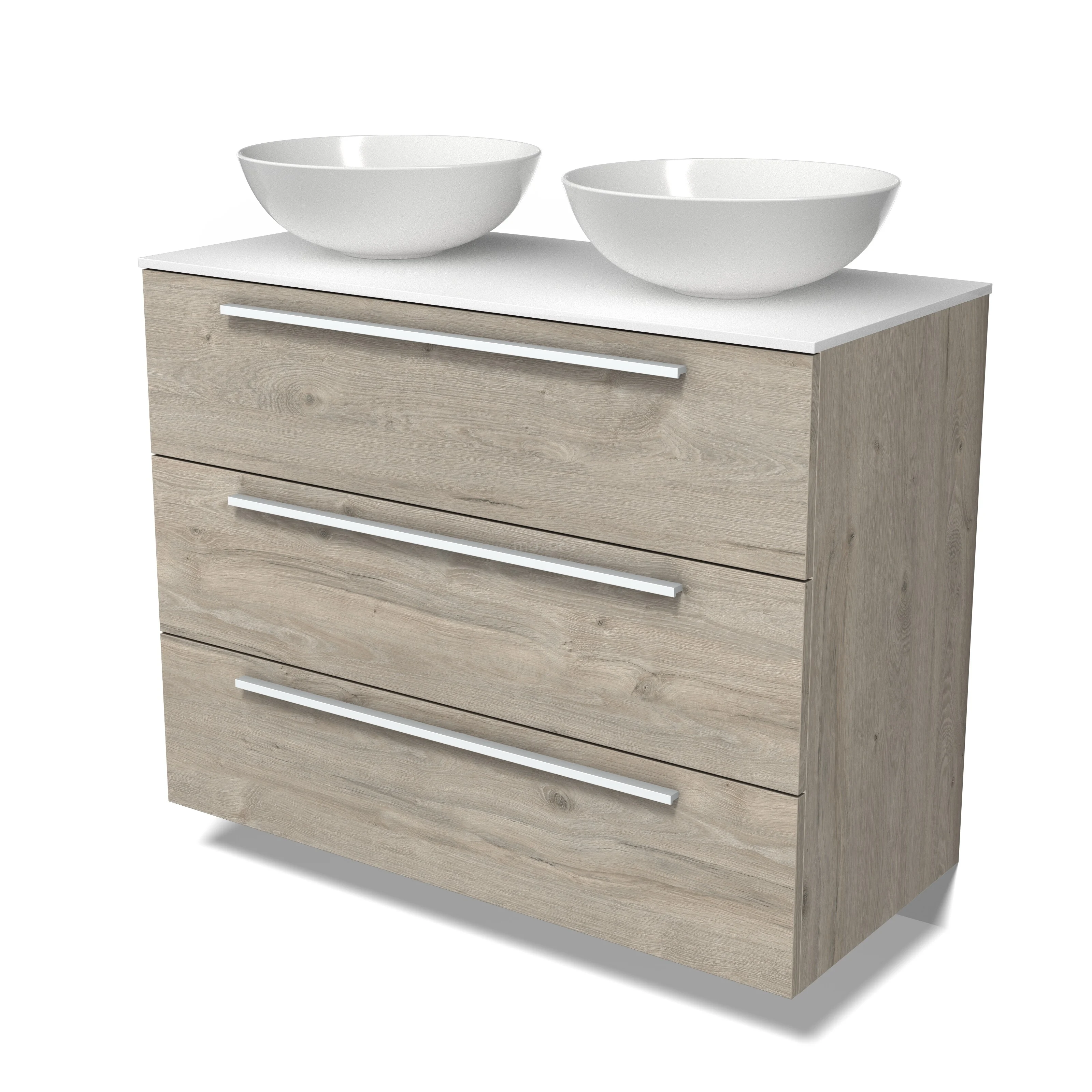 Modulo Plato Badkamermeubel voor waskom | 100 cm Lichtgrijs eiken Vlak front Solid surface blad 3 lades