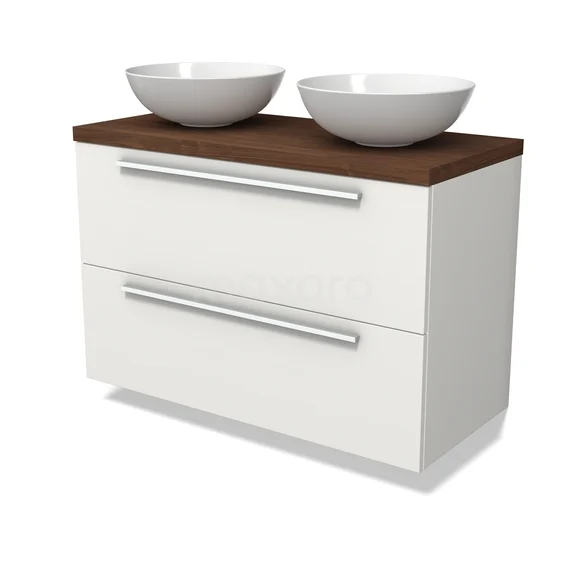 Modulo Plato Badkamermeubel voor waskom | 100 cm Mat wit Vlak front Walnoot blad 2 lades onder elkaar