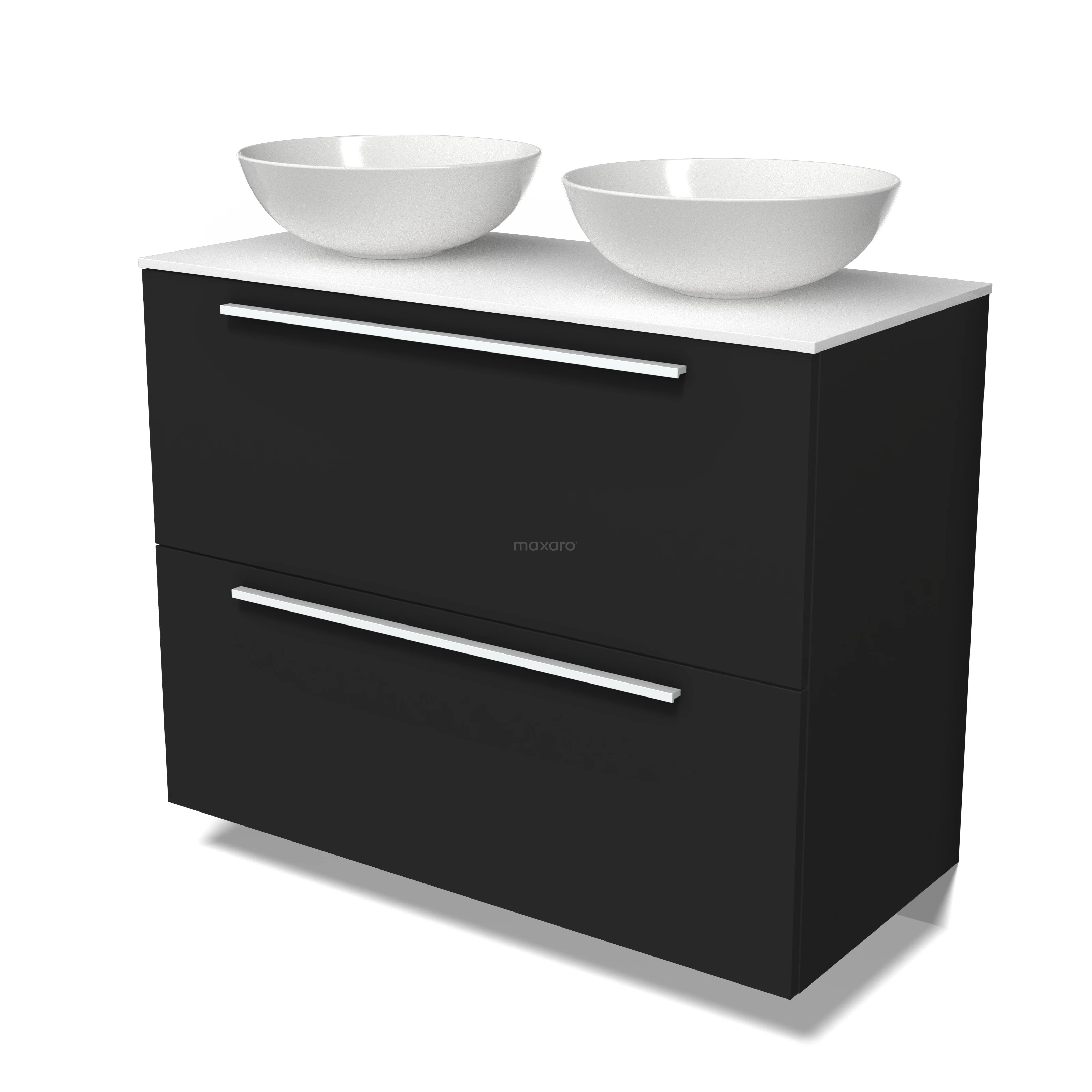 Modulo Plato Badkamermeubel voor waskom | 100 cm Mat zwart Vlak front Solid surface blad 2 hoge lades onder elkaar