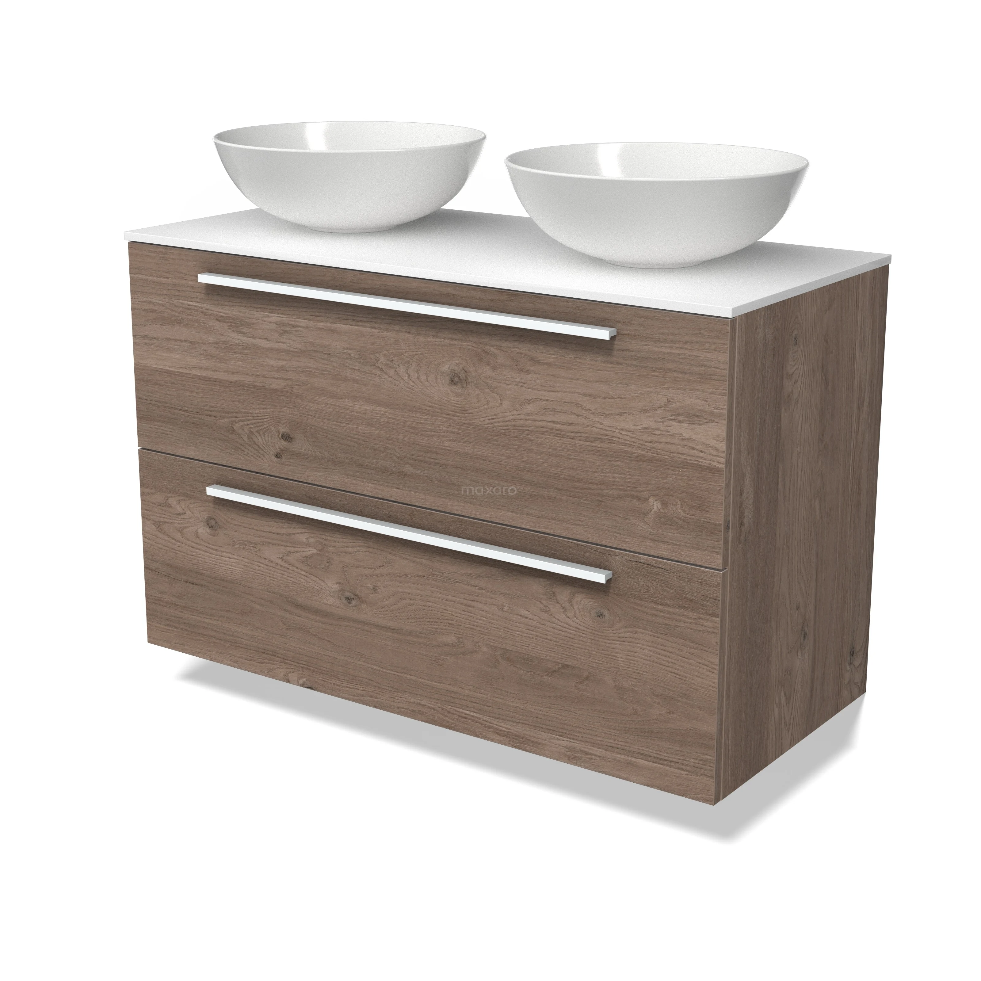 Modulo Plato Badkamermeubel voor waskom | 100 cm Middenbruin eiken Vlak front Solid surface blad 2 lades onder elkaar