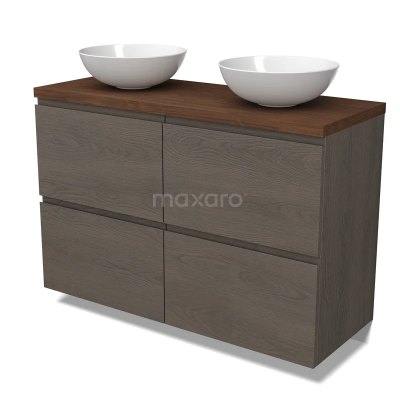 Modulo Plato Badkamermeubel voor waskom | 120 cm Donkerbruin eiken Greeploos front Walnoot blad 4 hoge lades