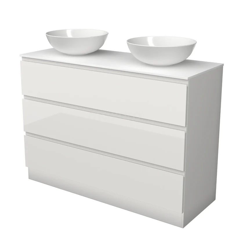 Modulo Plato Badkamermeubel voor waskom | 120 cm Hoogglans wit Greeploos front Solid surface blad 3 lades staand