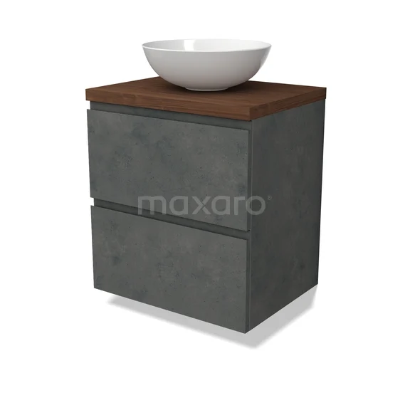 Modulo Plato Badkamermeubel voor waskom | 60 cm Donkergrijs beton Greeploos front Walnoot blad 2 lades onder elkaar