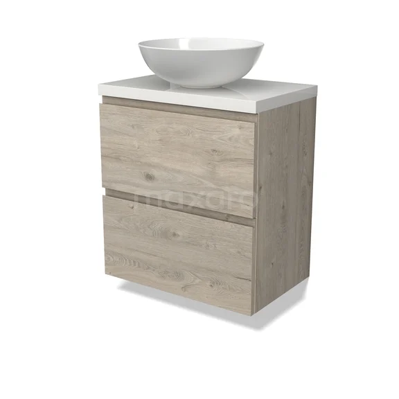 Modulo Plato Badkamermeubel voor waskom | 60 cm Lichtgrijs eiken Greeploos front Hoogglans wit blad 2 lades onder elkaar
