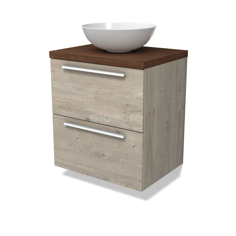 Modulo Plato Badkamermeubel voor waskom | 60 cm Lichtgrijs eiken Vlak front Walnoot blad 2 lades onder elkaar