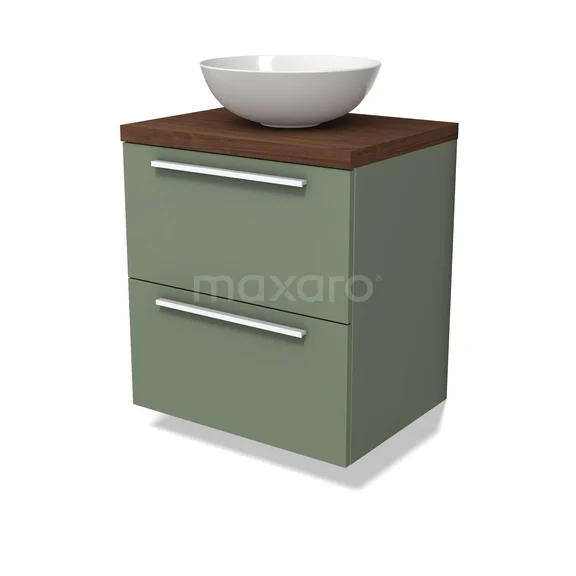 Modulo Plato Badkamermeubel voor waskom | 60 cm Saliegroen Vlak front Walnoot blad 2 lades onder elkaar