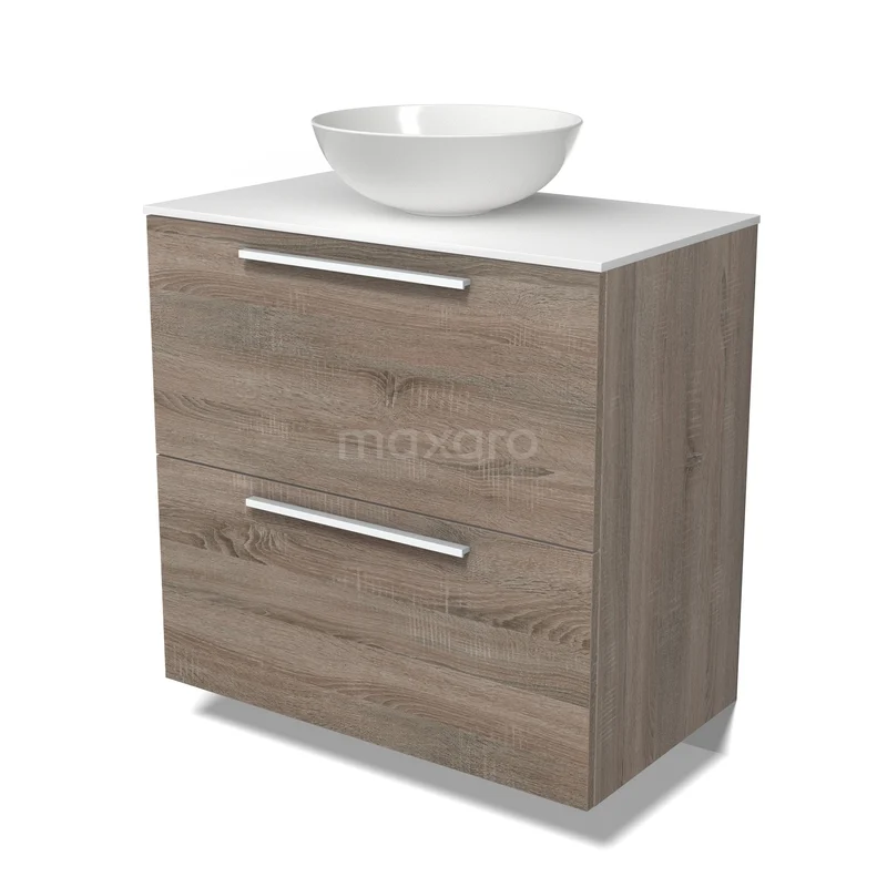 Modulo Plato Badkamermeubel voor waskom | 80 cm Eiken Vlak front Solid surface blad 2 hoge lades onder elkaar