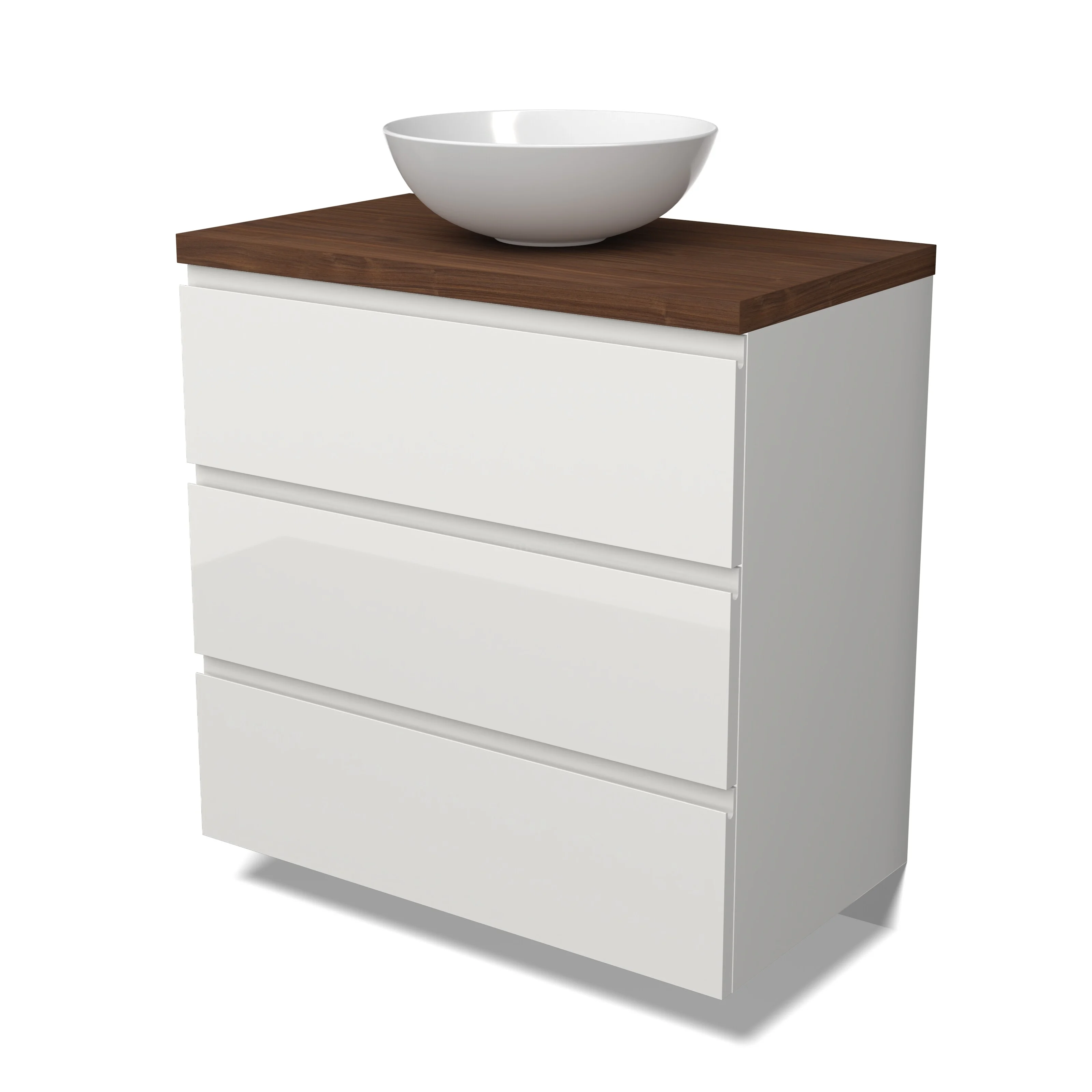 Modulo Plato Badkamermeubel voor waskom | 80 cm Hoogglans wit Greeploos front Walnoot blad 3 lades