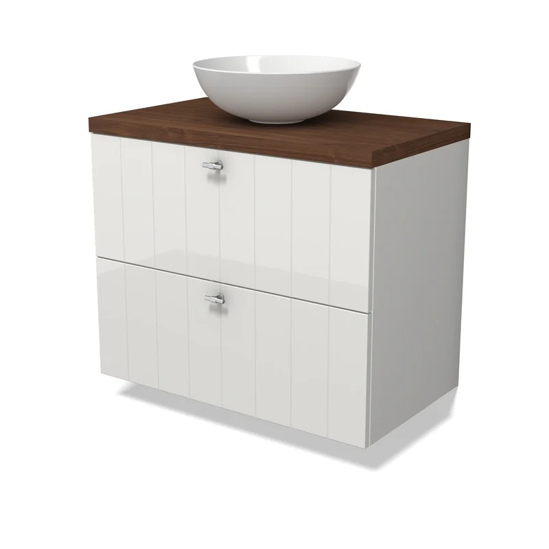 Modulo Plato Badkamermeubel voor waskom | 80 cm Hoogglans wit Lamel front Walnoot blad 2 lades onder elkaar