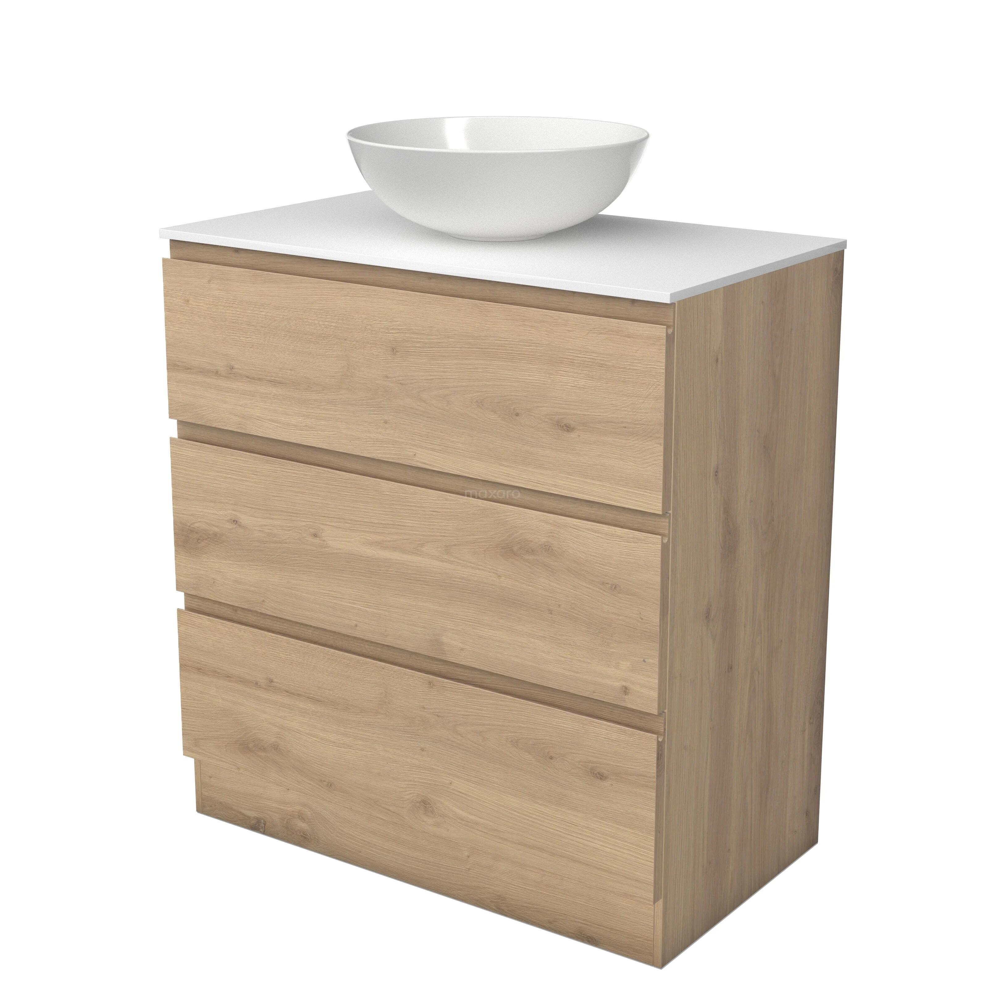 Modulo Plato Badkamermeubel voor waskom | 80 cm Lichtbruin eiken Greeploos front Solid surface blad 3 lades staand