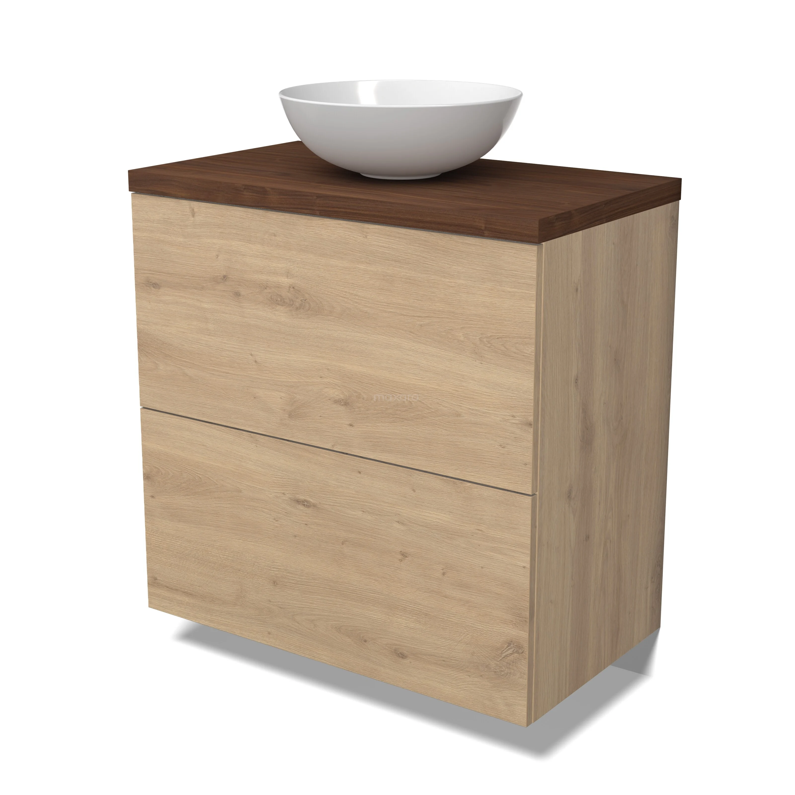 Modulo Plato Badkamermeubel voor waskom | 80 cm Lichtbruin eiken Vlak front Walnoot blad 2 hoge lades onder elkaar