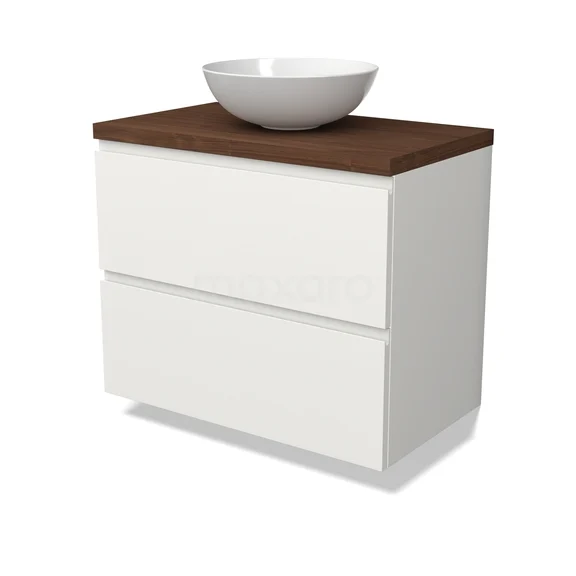 Modulo Plato Badkamermeubel voor waskom | 80 cm Mat wit Greeploos front Walnoot blad 2 lades onder elkaar
