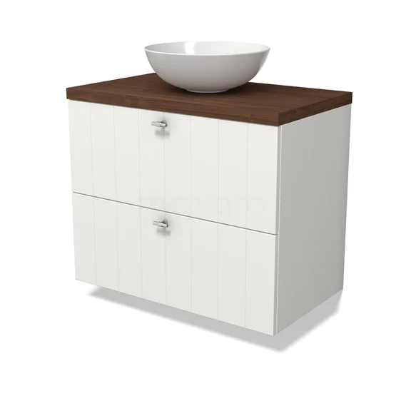 Modulo Plato Badkamermeubel voor waskom | 80 cm Mat wit Lamel front Walnoot blad 2 lades onder elkaar