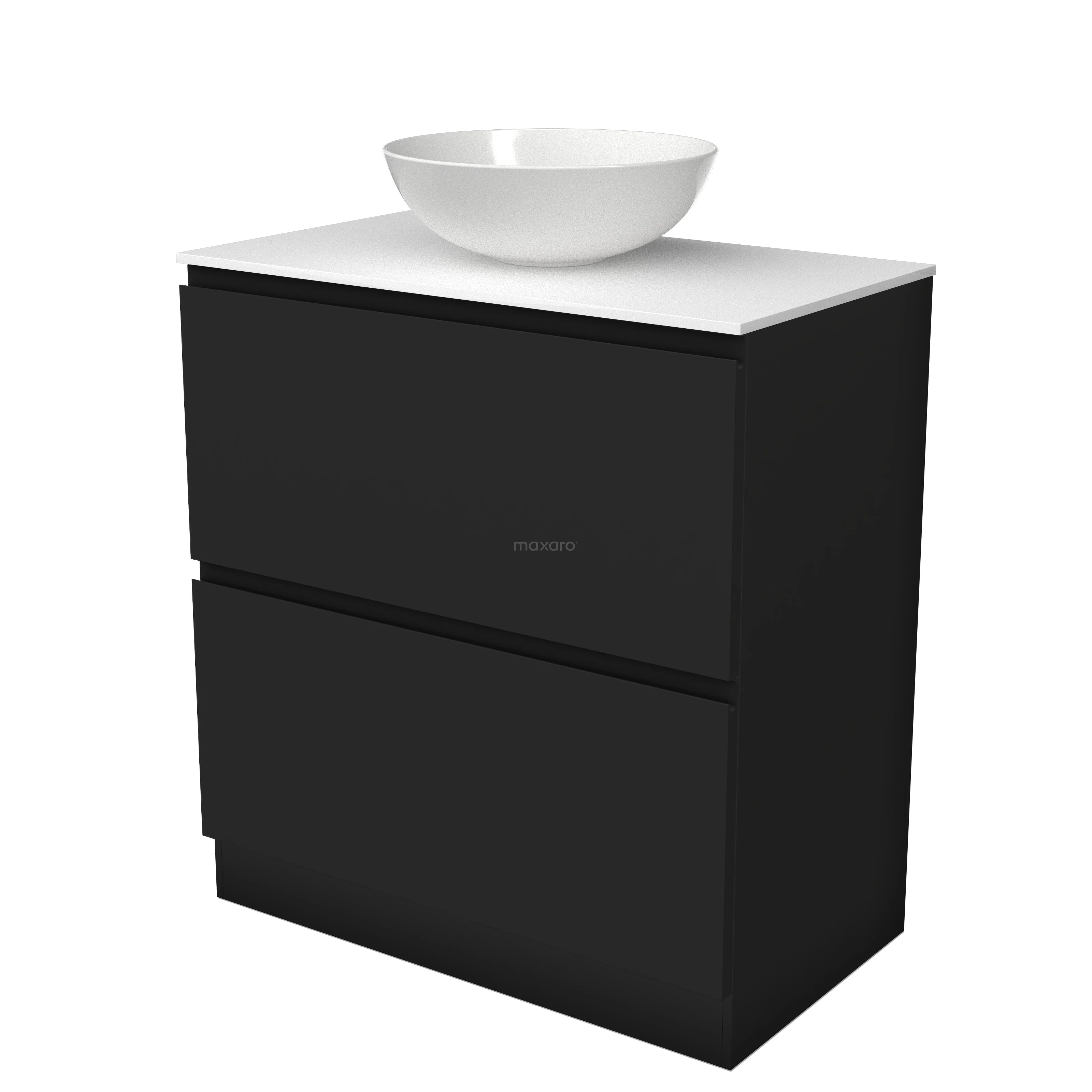 Modulo Plato Badkamermeubel voor waskom | 80 cm Mat zwart Greeploos front Solid surface blad 2 hoge lades onder elkaar staand