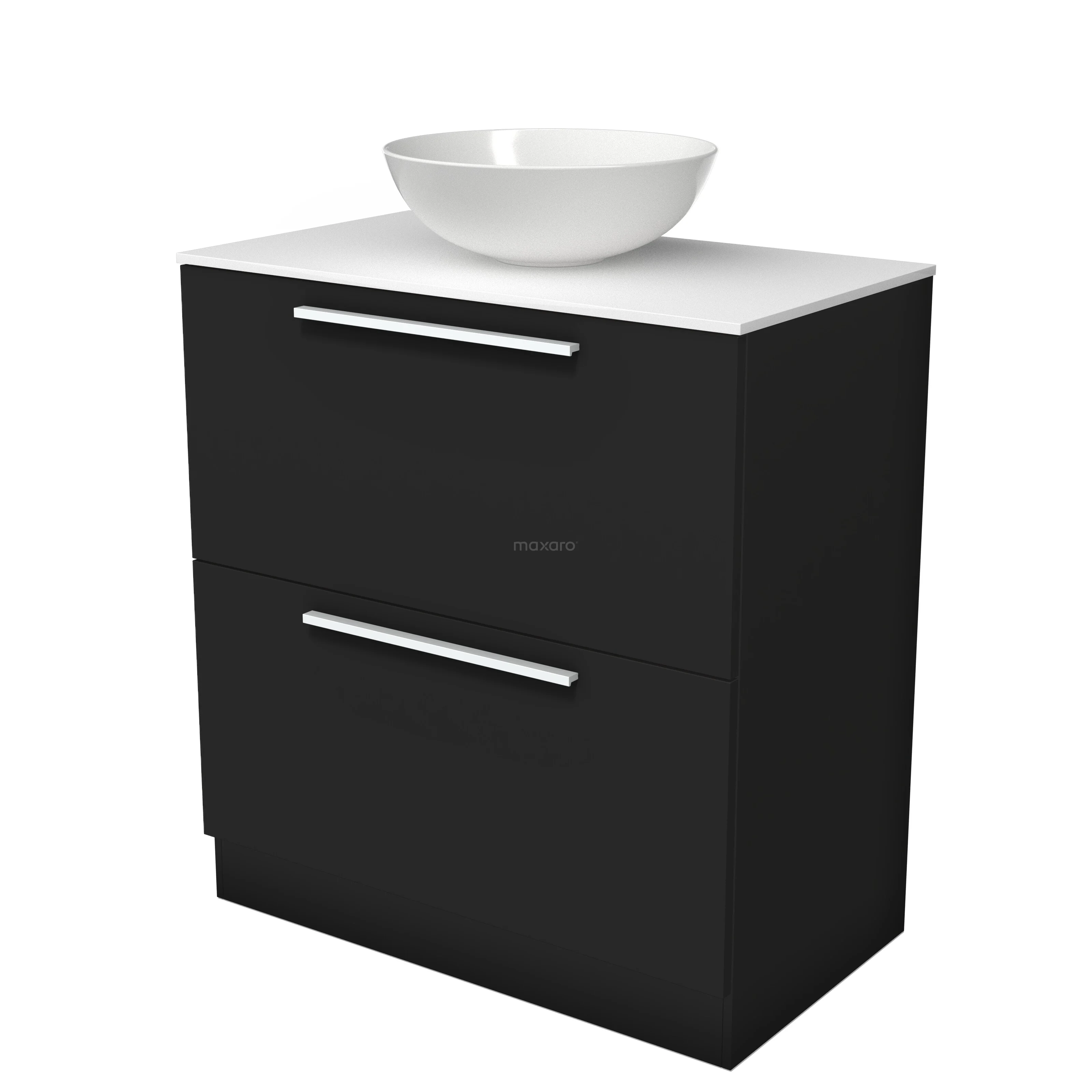 Modulo Plato Badkamermeubel voor waskom | 80 cm Mat zwart Vlak front Solid surface blad 2 hoge lades onder elkaar staand