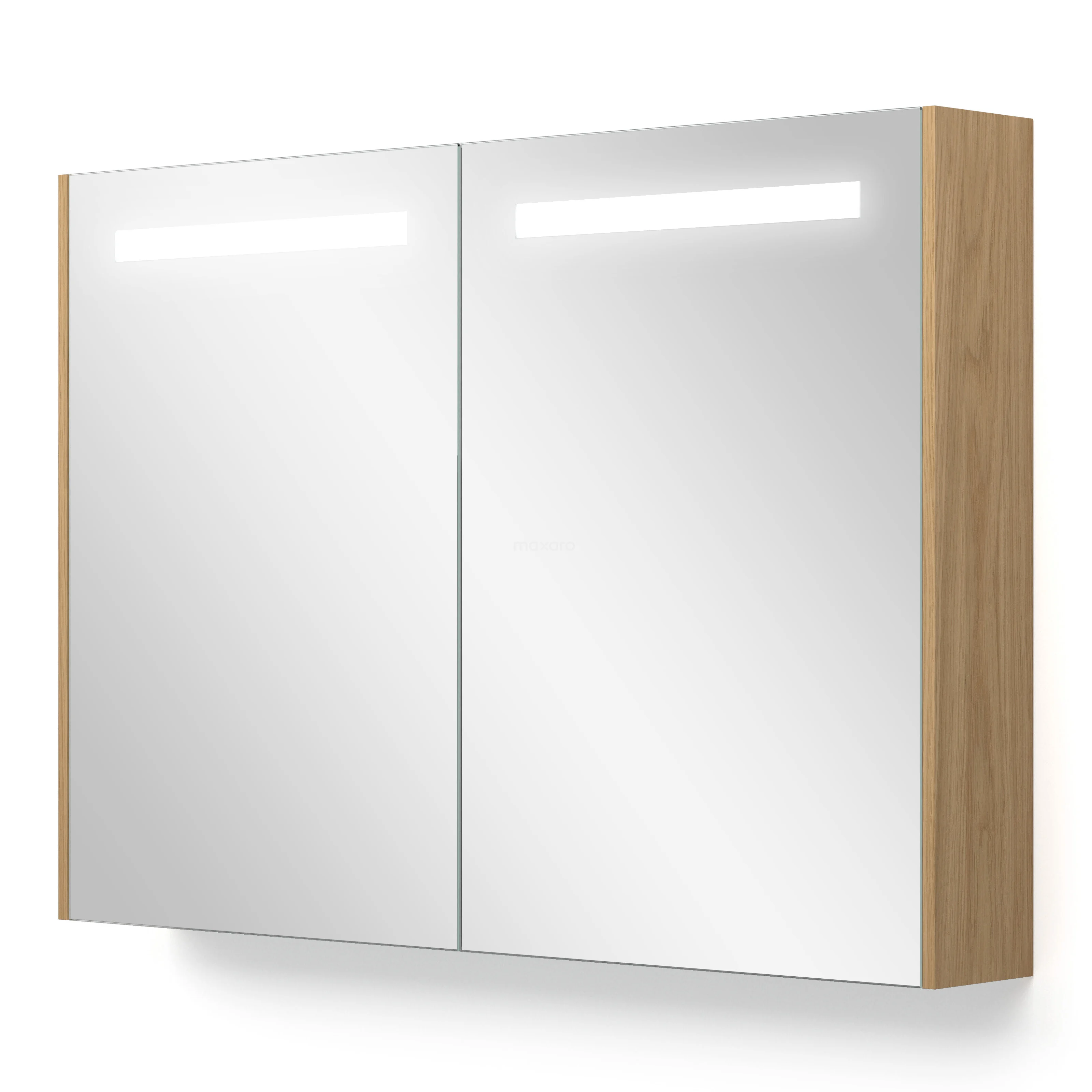 Deze stijlvolle spiegelkast heeft een rechthoekig design en is uitgevoerd in naturel fineer. Deze kleur sluit perfect aan bij je Modulo-badkamermeubel en vormt een prachtige aanvulling op je interieur. De verlichting geeft het geheel een sfeervolle uitstraling en is te bedienen met een aan- en uitschakelaar. Daarbij kun je de kleurtemperatuur naar wens instellen.
