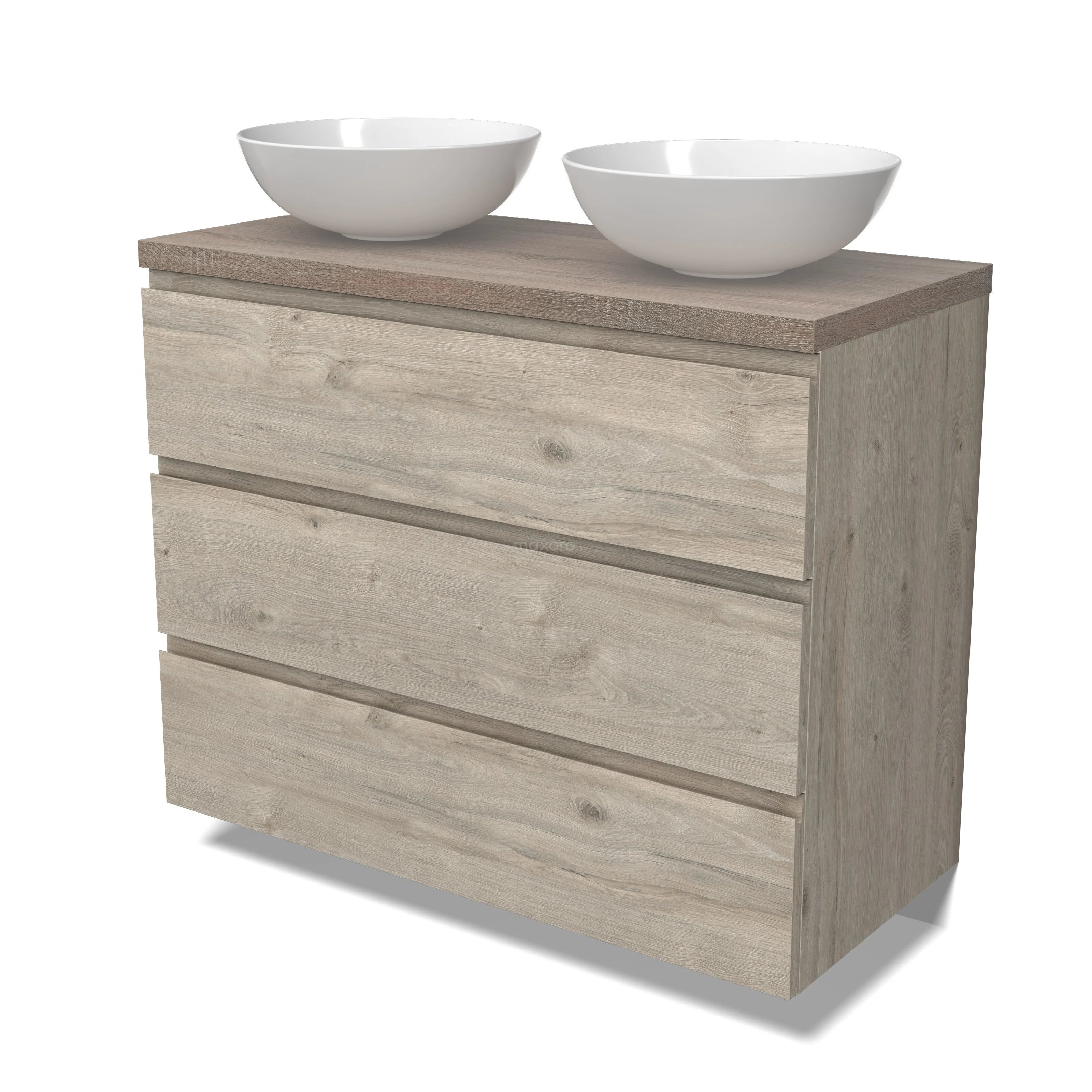 Modulo Plato Badkamermeubel voor waskom | 100 cm Lichtgrijs eiken Greeploos front Eiken blad 3 lades