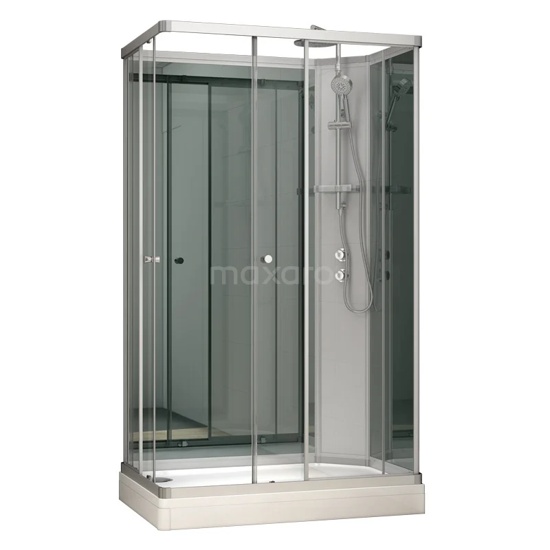 Dit stijlvolle, rechthoekige model van 120x80 cm biedt veel bewegingsvrijheid. Ideaal als u graag de ruimte heeft of samen doucht. U stapt er makkelijk via de hoek in en sluit de schuifdeuren met een soepele beweging. Naast 6 mm helder veiligheidsglas heeft de cabine spiegelglas. Dit geeft de douche een elegante touch en past goed bij de zilver gepoedercoate omlijsting. De douchebak is gemaakt van kwalitatief mineraalmarmer en voorzien van een beschermende gelcoating.