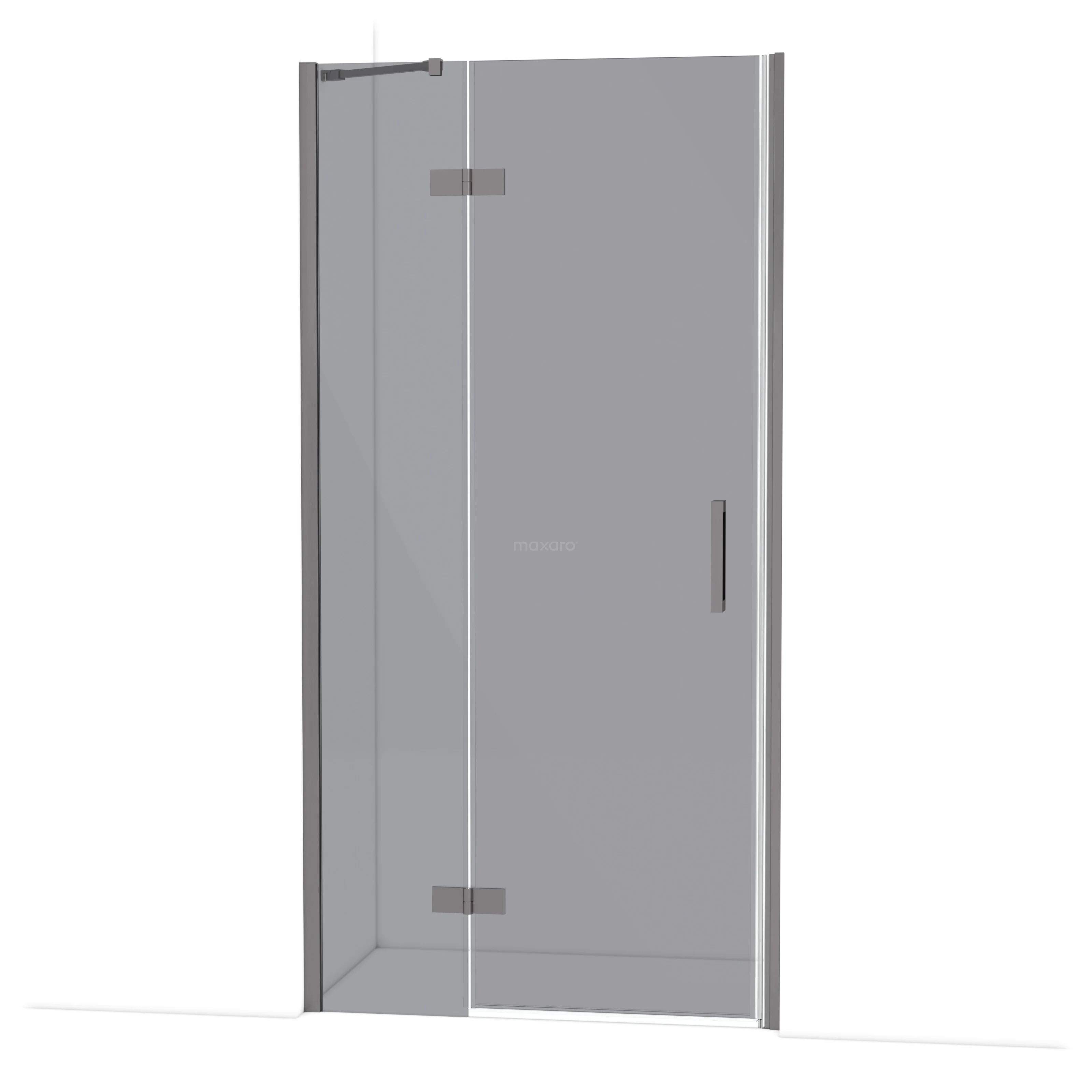 Douchewand van gehard grijs glas met strakke afwerking, ideaal voor moderne badkamers.