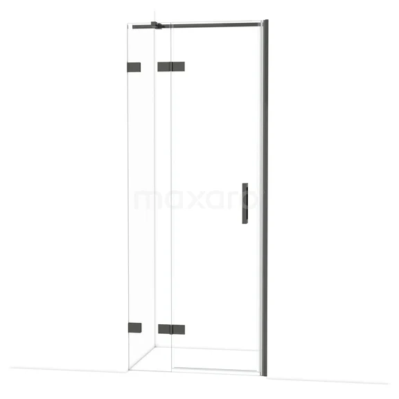 Heldere glazen douchescherm met slanke zwarte omlijsting, ideaal voor een moderne badkamerstijl.