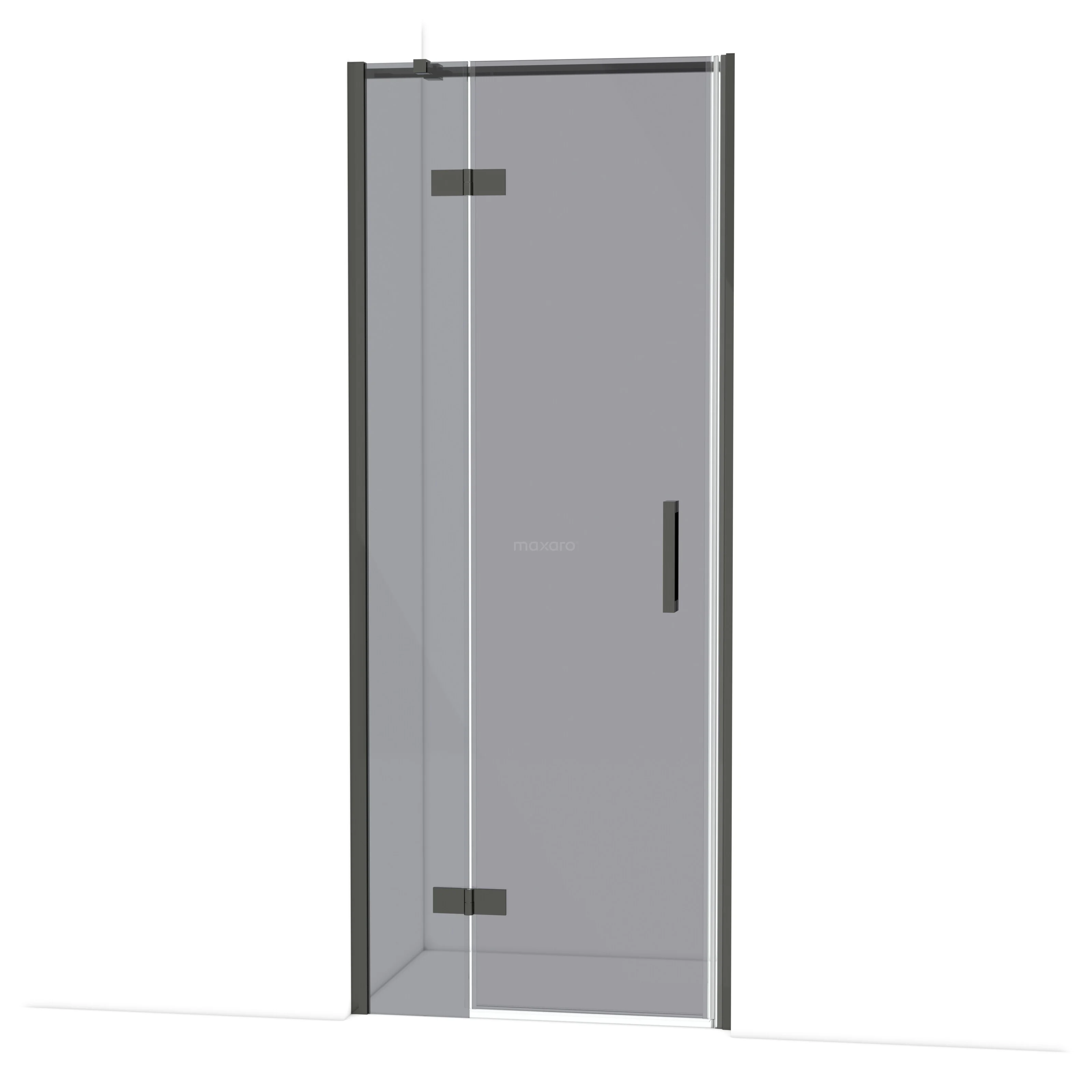 Douchewand van gehard grijs glas met strakke afwerking, ideaal voor moderne badkamers.
