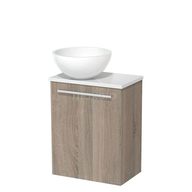 Stylish design Thanks to its beautiful design, the unit is an eye-catcher in the toilet area. The base cabinet has a grey oak finish with a grey oak basin worktop.