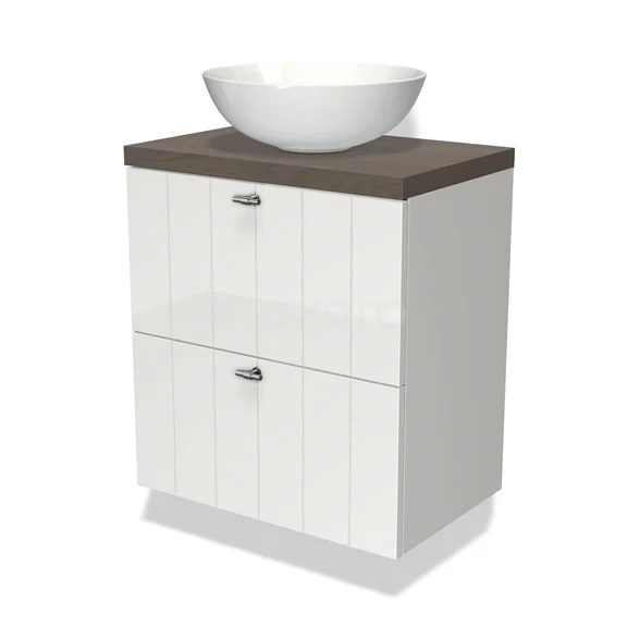 Modulo Plato Slim Vanity units for countertop basin | 60 cm High-gloss white Slat front Dark brown oak worktop 2 Stacked drawers