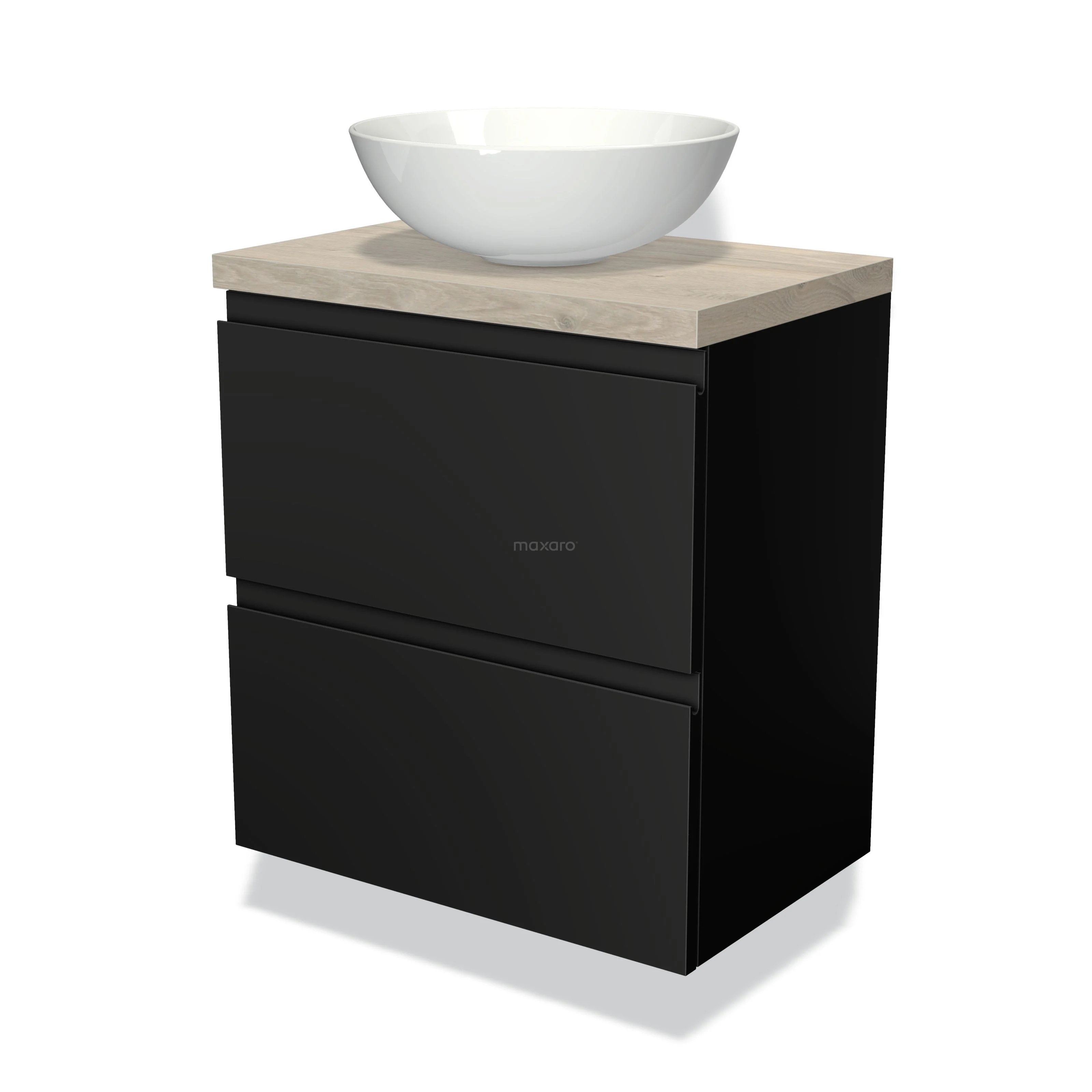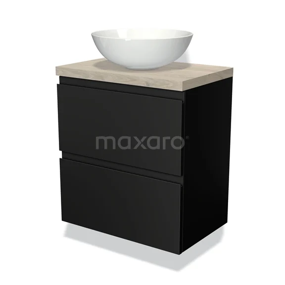 Modulo Plato Slim Vanity units for countertop basin | 60 cm Matte black Handle-less front Light grey oak worktop 2 Stacked drawers