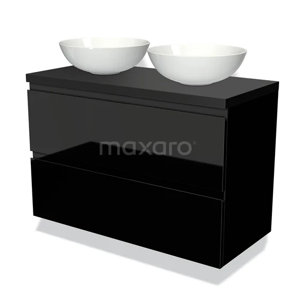Modulo Plato Vanity units for countertop basin | 100 cm High-gloss black Handle-less front Matte black worktop 2 Stacked drawers