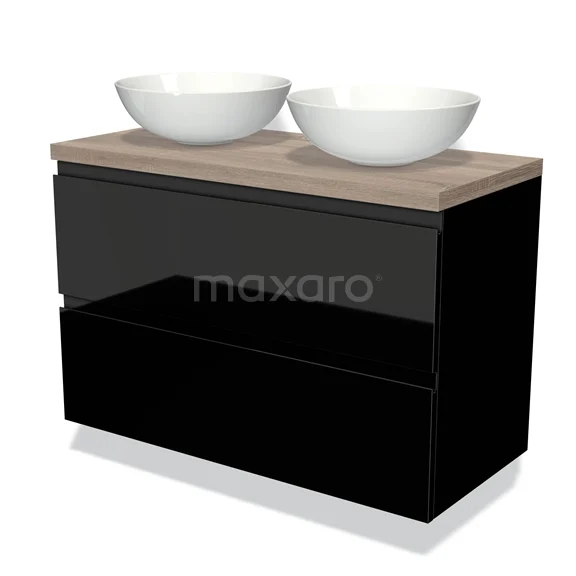 Modulo Plato Vanity units for countertop basin | 100 cm High-gloss black Handle-less front Oak worktop 2 Stacked drawers