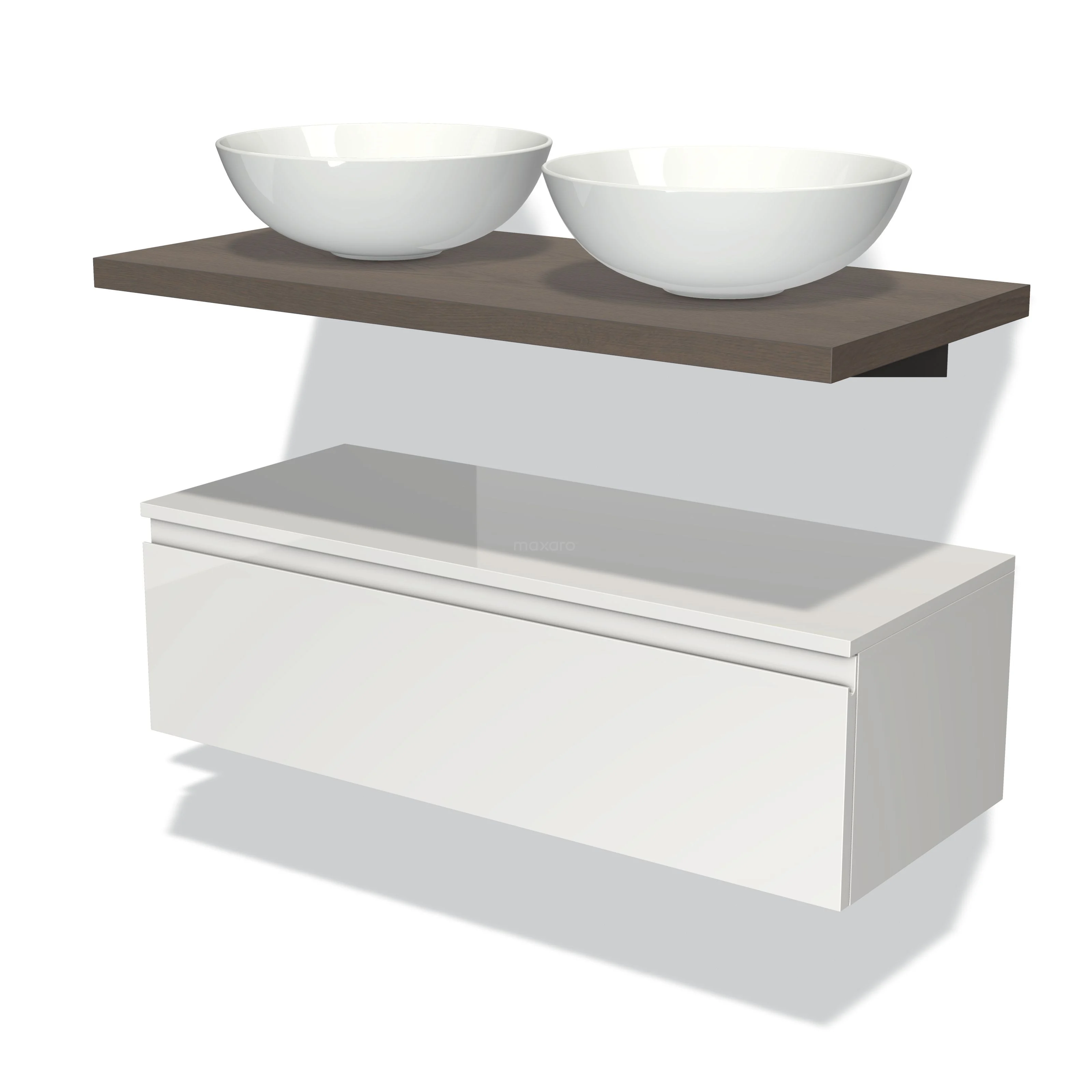 Modulo Plato Vanity units for countertop basin | 100 cm High-gloss white Handle-less front Dark brown oak worktop Low floating