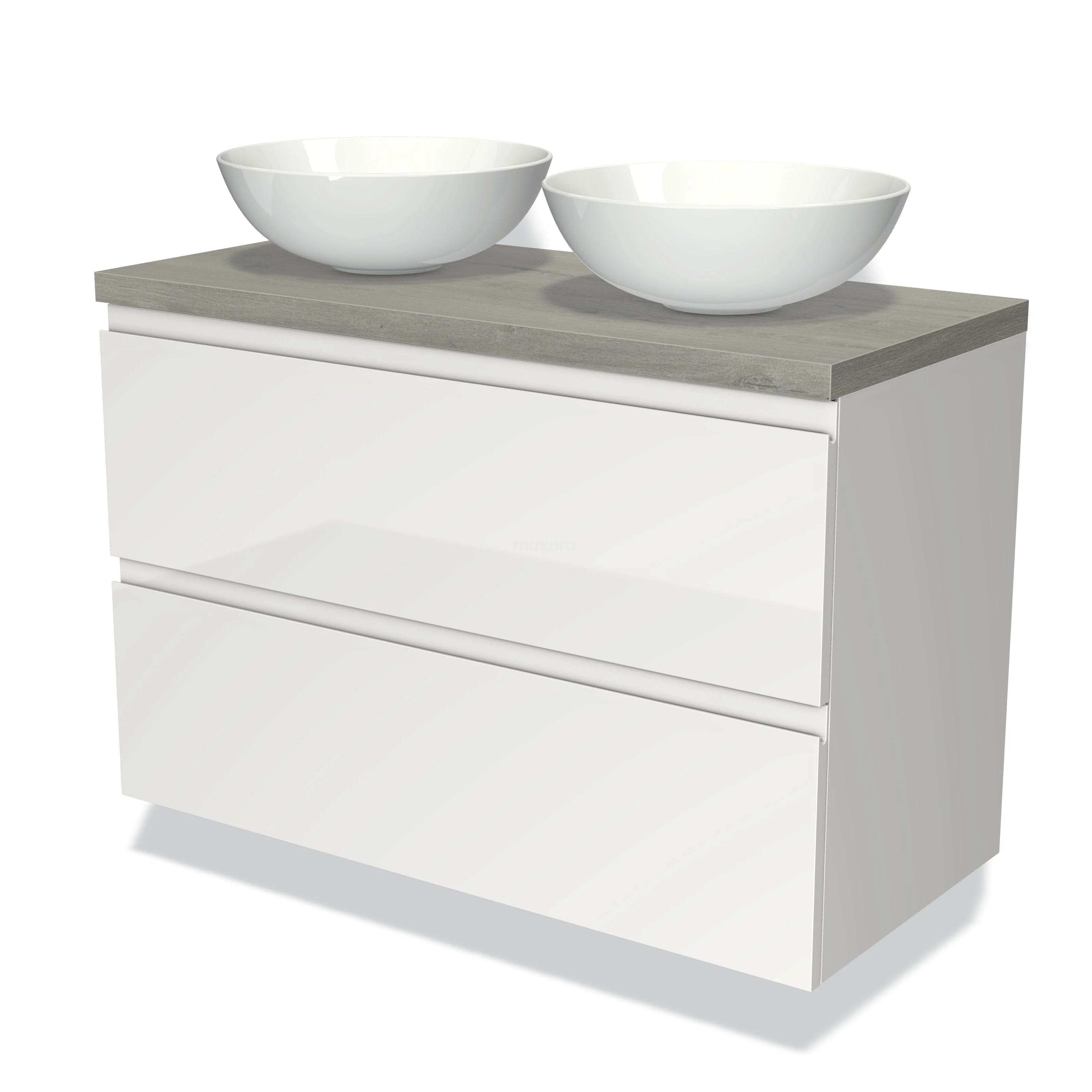 Modulo Plato Vanity units for countertop basin | 100 cm High-gloss white Handle-less front Grey oak worktop 2 Stacked drawers