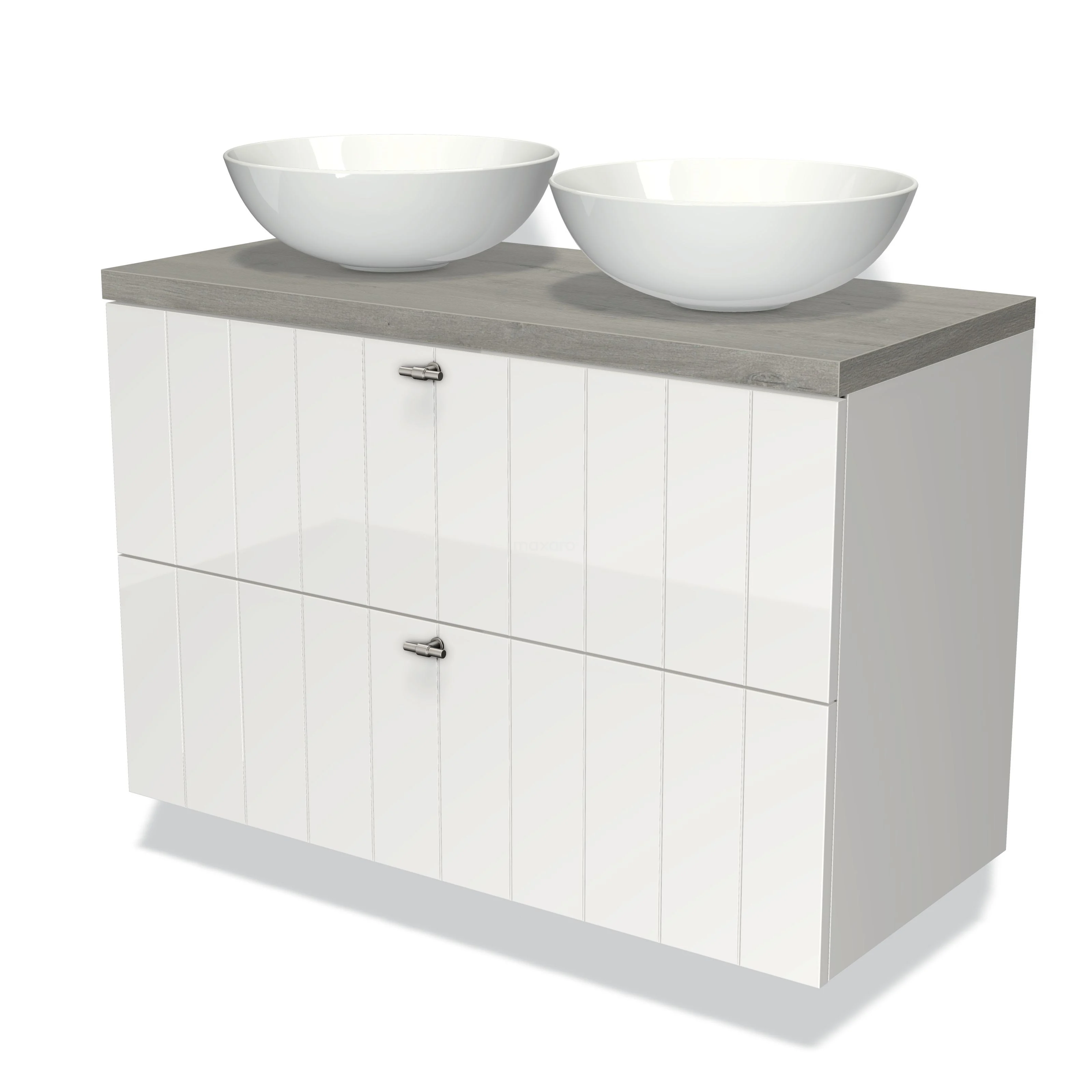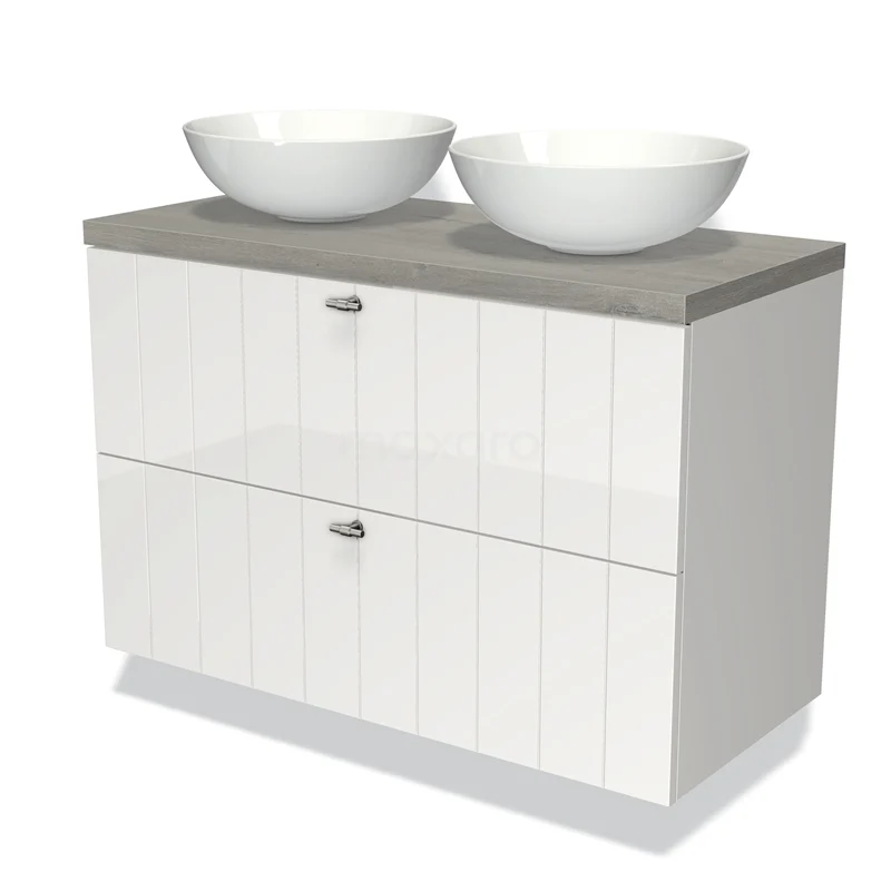 Modulo Plato Vanity units for countertop basin | 100 cm High-gloss white Slat front Grey oak worktop 2 Stacked drawers