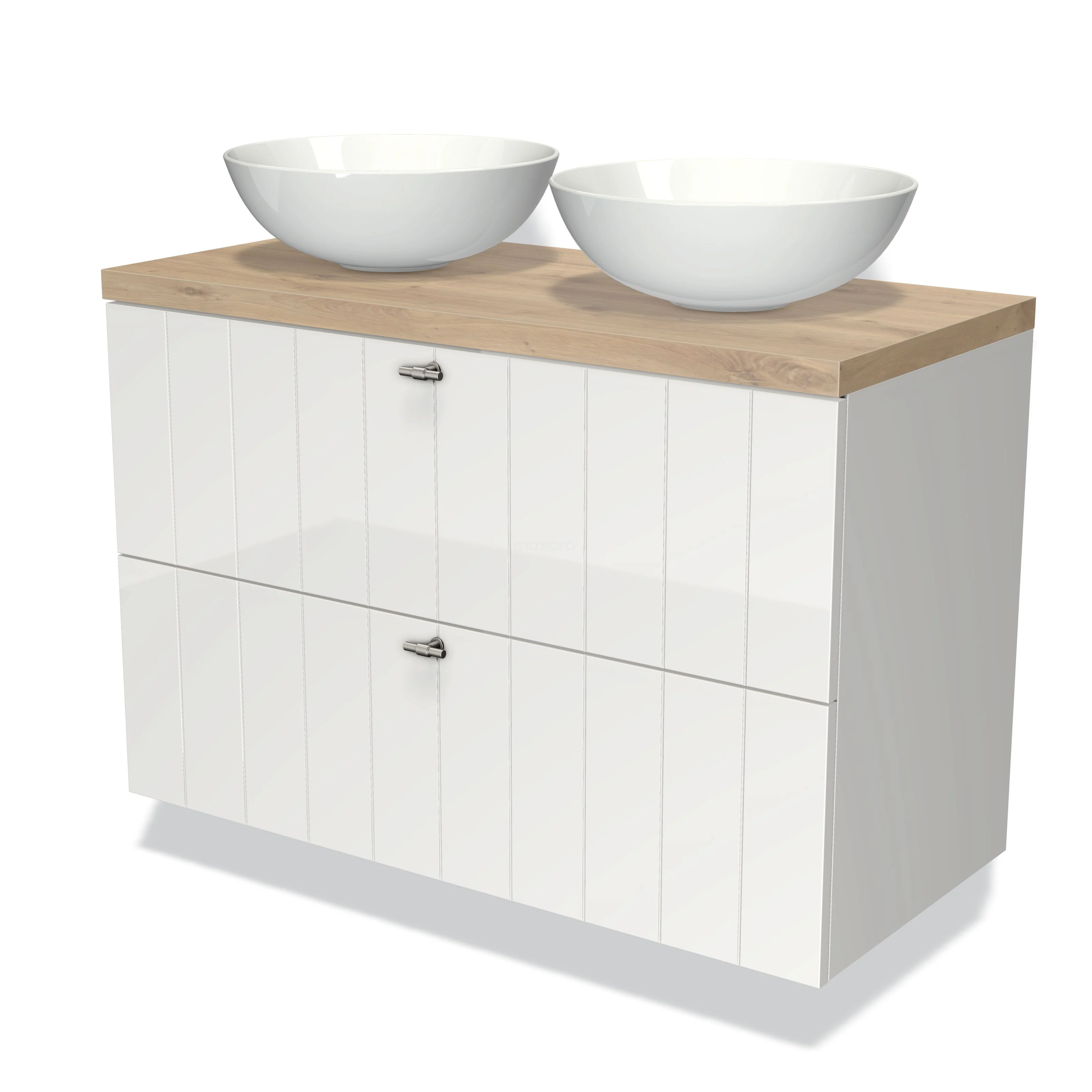 Modulo Plato Vanity units for countertop basin | 100 cm High-gloss white Slat front Light brown oak worktop 2 Stacked drawers