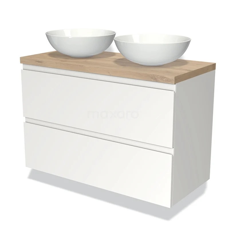 Modulo Plato Vanity units for countertop basin | 100 cm Matte white Handle-less front Light brown oak worktop 2 Stacked drawers