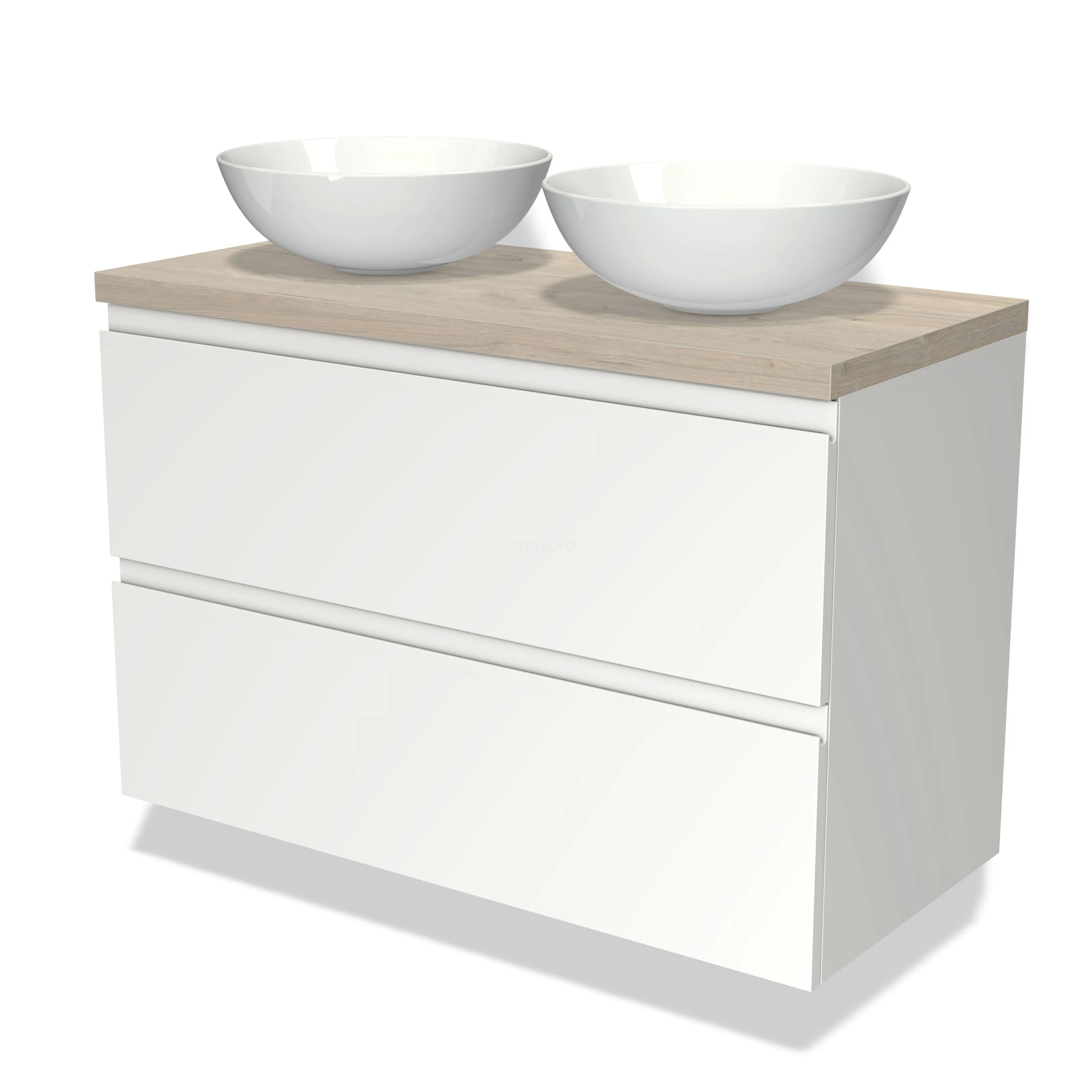 Modulo Plato Vanity units for countertop basin | 100 cm Matte white Handle-less front Light grey oak worktop 2 Stacked drawers